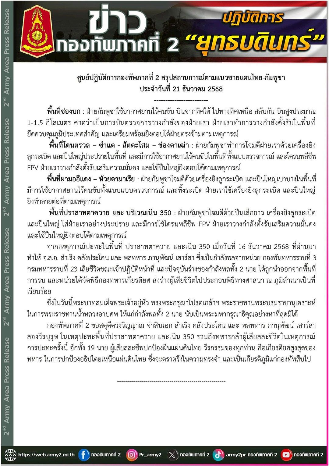 เมื่อวันที่ 21 ธันวาคม 2568 เพจเฟซบุ๊ก "กองทัพภาคที่ 2" โพสต์ข้อความระบุว่า ศูนย์ปฏิบัติการกองทัพภาคที่ 2 สรุปสถานการณ์ตามแนวชายแดนไทย-กัมพูชา ประจำวันที่ 21 ธันวาคม 2568