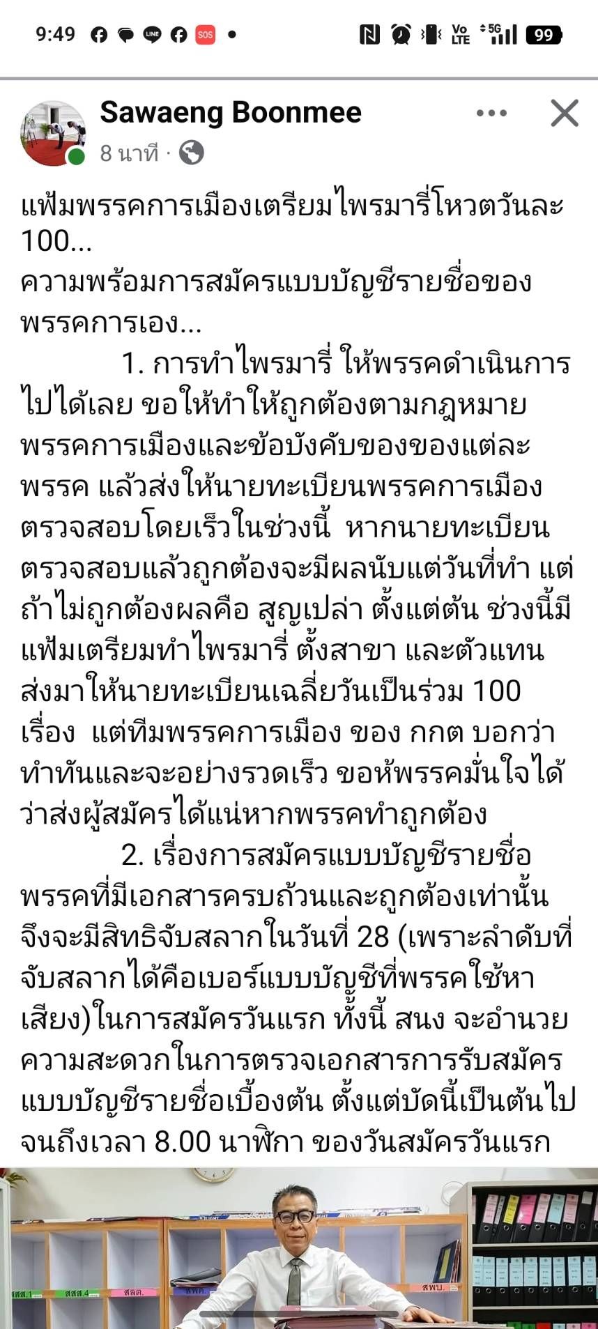 เมื่อวันที่ 22 ธ.ค.2568 นายแสวง บุญมี เลขาการคณะกรรมการการเลือกตั้ง (กกต.) โพสต์ข้อความถึงความพร้อมการทำไพรมารีโหวต ว่าวันนี้มีพรรคการเมืองส่งเอกสารจัดตั้งสาขาและตัวแทนพรรค ซึ่งส่งเข้ามาถึง กกต.วันละ 100 แฟ้ม และการเตรียมตัวสมัครสส.แบบบัญชีรายชื่อของพรรคการเมืองนั้น พรรคการเมืองสามารถดำเนินการได้เลย ก็ขอให้มั่นใจว่าสามารถตรวจสอบ และส่งผู้สมัครได้ทัน แต่ต้องถูกกฎหมายพรรคการเมืองและข้อบังคับพรรค ขณะที่การส่งผู้สมัครแบบบัญชีรายชื่อ พรรคที่มีเอกสารถูกต้องครบถ้วนเท่านั้นจึงจะสามารถส่งผู้สมัครได้ โดยสำนักงานฯจะอำนวยความสะดวกตรวจสอบเอกสารเบื้องต้นให้กับพรรคการเมืองไปจนถึงเวลา 08.00 น ของวันรับสมัคร
