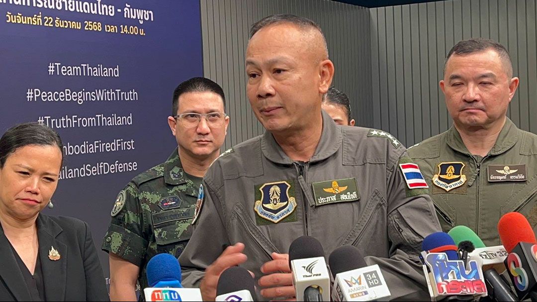เวลา 14.00 น.ที่ศูนย์แถลงข่าวร่วม สถานการณ์ไทย-กัมพูชา ที่สถานีวิทยุโทรทัศน์กองทัพบก พลเรือตรี สุรสันต์ คงสิริ โฆษกกระทรวงกลาโหมแถลงว่า กองทัพไทยมีหลักฐานว่ากัมพูชาใช้ที่ตั้งในหมู่บ้านของกัมพูชาเพื่อซ่อนพลาง และเป็นฐานโจมตีฝ่ายไทย ซึ่งเราจะรวบรวมนําไปประท้วงในเวทีนานาชาติได้รับทราบถึงความโหดร้ายของกัมพูชาที่ละเมิดสิทธิและอนุสัญญาต่างๆ ระหว่างประเทศ สำหรับสถานการณ์ตั้งแต่วันที่ 21 ธันวาคม มีการเปิดฉากยิงโดยเขมรมายังพื้นที่ชุมชน อ.อรัญประเทศ จังหวัดสระแก้ว ทําให้ไทยประกาศฉุกเฉินอพยพประชาชนออกจากพื้นที่เร่งด่วน ในส่วนของกาสิโนทมอดา ชายแดน จ.ตราด กองทัพเรือและกองทัพอากาศร่วมปฎิบัติการจนควบคุมได้เบ็ดเสร็จ ขณะเดียวกัน เช้าวันนี้ (22 ธันวาคม) เขมรยังโจมตีพลเรือน ทําให้ลูกระเบิดตกในพื้นที่เกษตร ยุ้งข้าวชาวบ้านเสียหาย และยิงอาวุธหนักใส่ที่ตั้งฝ่ายไทยทําให้ทหารไทยเสียชีวิต 1นาย
