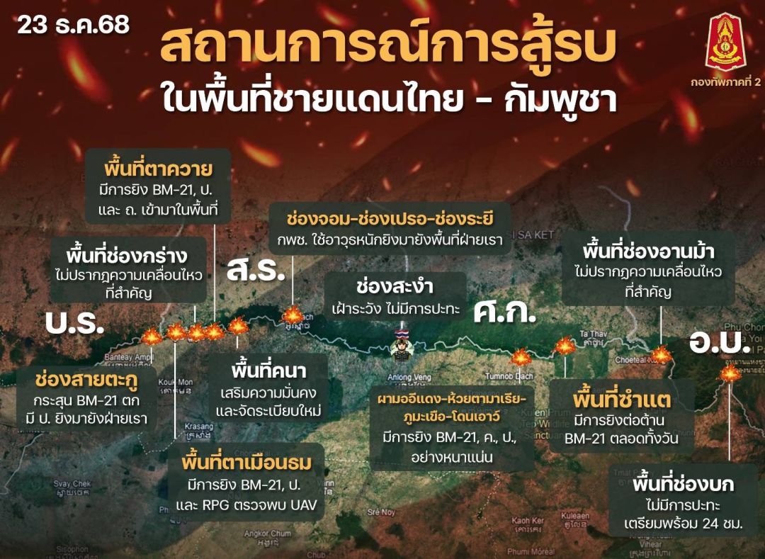 เมื่อเวลา 08.30 น. วันที่ 23 ธ.ค. 2568 กองทัพภาคที่ 2 สรุปสถานการณ์ตามแนวชายแดนไทย–กัมพูชา ในหลายพื้นที่ของกองทัพภาคที่ 2 โดยภาพรวม ยังคงมีการประทะ กันในพื้นที่จังหวัดศรีสะเกษและสุรินทร์ ขณะที่ฝ่ายไทยยังสามารถควบคุมสถานการณ์ในสนามรบไว้ได้ โดยทางฝ่ายกัมพูชายังคงใช้ จรวดหลายลำกล้อง BM-21 ยิงเป็นชุดเข้ามาฝั่งไทย เพื่อหวังกดดันและสร้างผลกระทบทางจิตวิทยา ขณะที่ฝ่ายไทยตอบโต้ด้วยการรวมอำนาจการยิงอย่างเป็นระบบ และใช้โดรนโจมตีเป้าหมายสำคัญ รวมถึงระบบการสื่อสารของฝ่ายตรงข้าม ทำให้ยังสามารถรักษาฐานที่มั่นไว้ได้ ทั้งนี่กำลังพลได้รับบาดเจ็บบางนาย