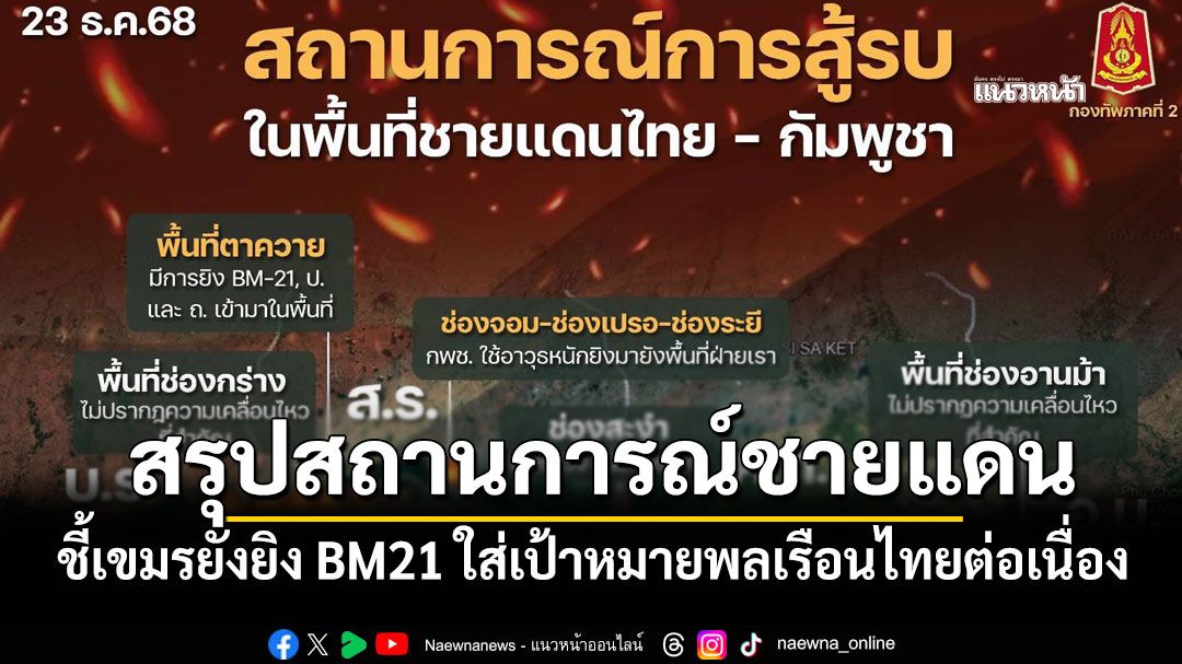กองทัพภาคที่ 2 สรุปสถานการณ์ชายแดนไทย–กัมพูชา 23 ธ.ค.68 ปะทะหนักหลายจุด ศรีสะเกษ–สุรินทร์ ตึงเครียด ฝ่ายไทยคุมสถานการณ์ได้ ชี้เขมรยังคงใช้จรวดไร้ทิศทาง หลายลำกล้อง BM21 ยิงเป้าหมายพลเรือนไทยต่อเนื่อง