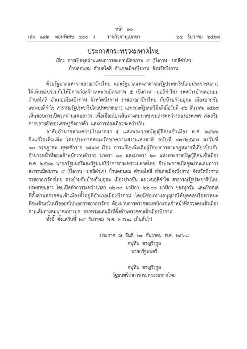 "ขณะนี้ นายอนุทิน ชาญวีรกูล นายกรัฐมนตรีในฐานะรัฐมนตรีว่าการกระทรวงมหาดไทย ได้ลงนามประกาศกระทรวงมหาดไทย เรื่อง การเปิดจุดผ่านแดนถาวรสะพานมิตรภาพ 5 (บึงกาฬ - บอลิคำไซ) บ้านดอนยม ตำบลไคสี อำเภอเมืองบึงกาฬ จังหวัดบึงกาฬ ตั้งแต่วันที่ 25 ธ.ค. 68 เป็นต้นไป โดยเปิดทำการตั้งแต่เวลา 06.00 - 22.00 น. ทุกวันซึ่งบุคคลหรือยานพาหนะที่เข้ามาในราชอาณาจักรไทยหรือออกไปนอกราชอาณาจักรไทย ต้องผ่านการตรวจของเจ้าหน้าที่ตรวจคนเข้าเมือง (ตม.) ตามเส้นทางคมนาคมทางบกจากพรมแดนถึงที่ตั้งด่านตรวจคนเข้าเมืองบึงกาฬ ซึ่งขณะนี้ได้ประกาศในราชกิจจานุเบกษาแล้ว" นายอรรษิษฐ์ กล่าว