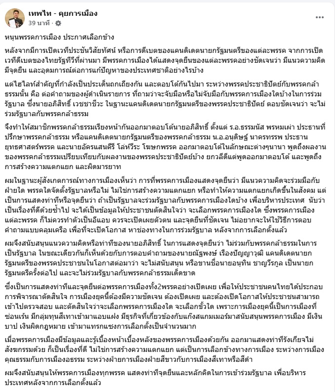ซึ่งเป็นการแสดงท่าทีและจุดยืนต่อพรรคการเมืองทั้ง2พรรคอย่างเปิดเผย เพื่อให้ประชาชนคนไทยได้ประกอบการพิจารณาตัดสินใจ การเมืองยุคนี้ต้องมีความชัดเจน ต้องเปิดเผย และต้องเปิดโอกาสให้ประชาชนสามารถเข้าไปตรวจสอบ และตัดสินใจว่าจะเลือกพรรคการเมืองใด จะเลือกขั้วใด เพราะการเมืองยุคนี้เป็นการเมืองที่ซ่อนเร้น มีกลุ่มทุนสีเทาเข้ามาแอบแฝง มีธุรกิจที่เกี่ยวข้องกับแก๊งสแกมเมอร์มาสนับสนุนพรรคการเมือง มีเงินบาป เงินผิดกฎหมาย เข้ามาแทรกแซงการเลือกตั้งเป็นจำนวนมาก