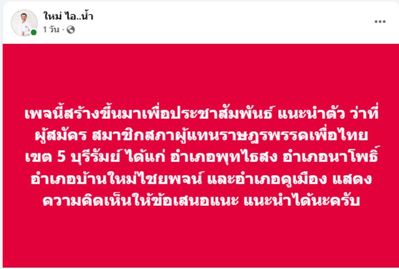โดยเจ้าตัว ได้ทำการเปิดเพจเฟซบุ๊กอย่างเป็นทางการเพื่อประชาสัมพันธ์และแนะนำตัวกับพี่น้องประชาชน โดยประกาศชัดเจนว่าจะลงชิงชัยในศึกเลือกตั้ง ว่าที่ผู้สมัครสมาชิกสภาผู้แทนราษฎรพรรคเพื่อไทย เขต 5 บุรีรัมย์ ได้แก่ อำเภอพุทไธสง อำเภอนาโพธิ์ อำเภอบ้านใหม่ไชยพจน์ และอำเภอคูเมือง