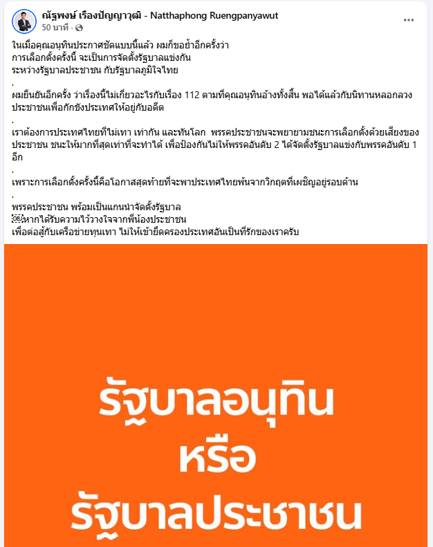นายณัฐพงษ์ เรืองปัญญาวุฒิ หัวหน้าพรรคประชาชน โพสต์ข้อความผ่านเฟซบุ๊กส่วนตัว ตอบโต้ท่าทีทางการเมืองของนายอนุทิน ชาญวีรกูล หัวหน้าพรรคภูมิใจไทย โดยระบุว่าการเลือกตั้งที่กำลังจะมาถึงจะเป็นการต่อสู้กันอย่างชัดเจนระหว่างสองขั้วอำนาจ คือ "รัฐบาลประชาชน" กับ "รัฐบาลภูมิใจไทย" โดยระบุว่า