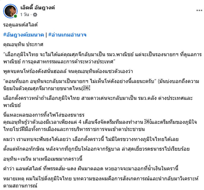 วันที่ 25 ธันวาคม 2568 เอ็ดดี้ อัษฎางค์ นักวิชาการอิสระ ได้ออกมาเคลื่อนไหวบนโลกออนไลน์ผ่านเฟซบุ๊กส่วนตัว ระบุว่า รอดูแลนด์สไลด์ #อัษฎางค์ยมนาค | #อ่านเกมอำนาจ
