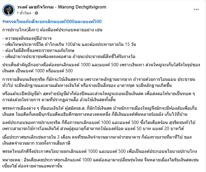 พรรคไทยภักดีจะยกเลิกแบงค์1000และแบงค์500