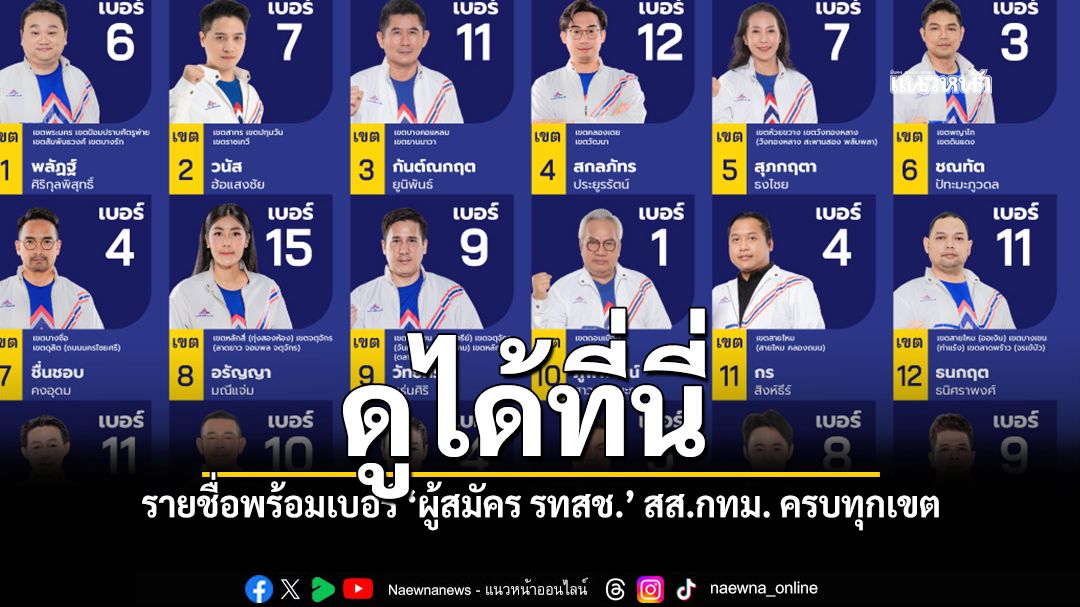 วันที่ 27 ธ.ค. 2568 ภายหลังเสร็จสิ้นการรับสมัครเลือกตั้งสมาชิกสภาผู้แทนราษฎร (สส.) แบบแบ่งเขตเลือกตั้ง และการจับสลากหมายเลขประจำตัวผู้สมัคร พรรครวมไทยสร้างชาติได้ประกาศรายชื่อพร้อมหมายเลขผู้สมัครทั้ง 33 เขตในพื้นที่กรุงเทพมหานคร เพื่อเตรียมความพร้อมเดินหน้าหาเสียง ดังนี้