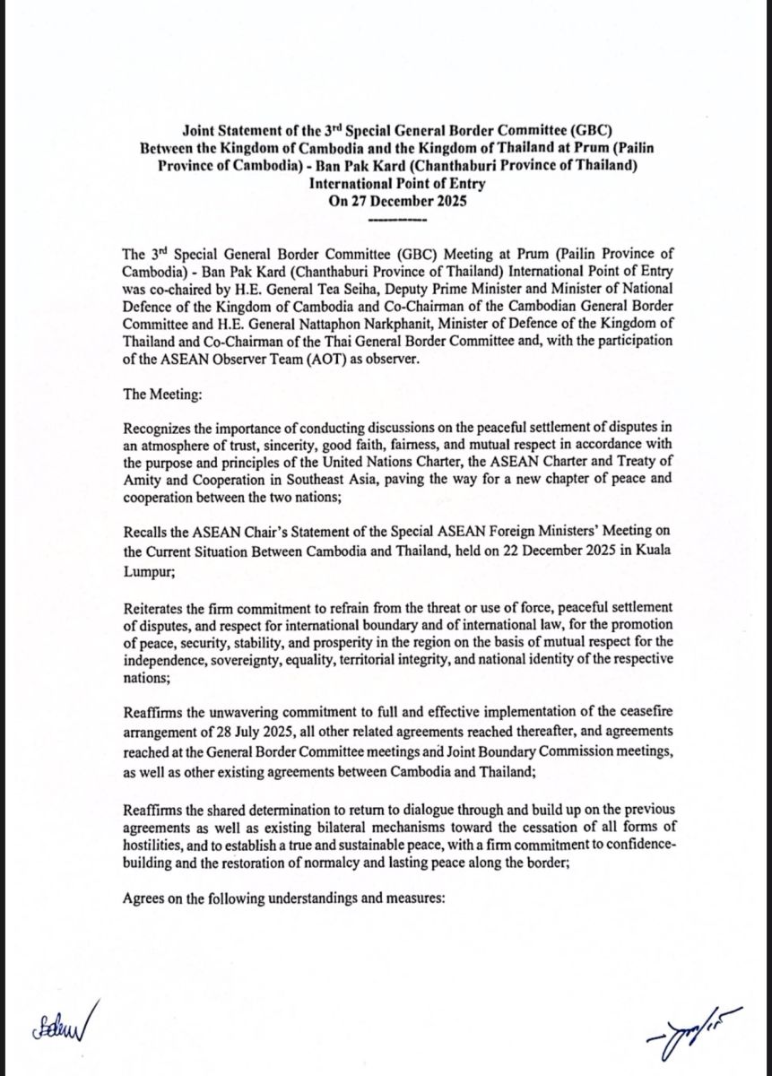 สำหรับแถลงผลการประชุม คณะกรรมการชายแดนทั่วไปกัมพูชา-ไทย (GBC) พล.อ.ณัฐพล นาคพาณิชย์ รัฐมนตรีว่าการกระทรวงกลาโหม พล.อ.เตรียเซยฮา รัฐมนตรีว่าการกระทรวงการต่างประเทศ ร่วมลงนามในถ้อยแถลงร่วม Joint Statement ดังนี้