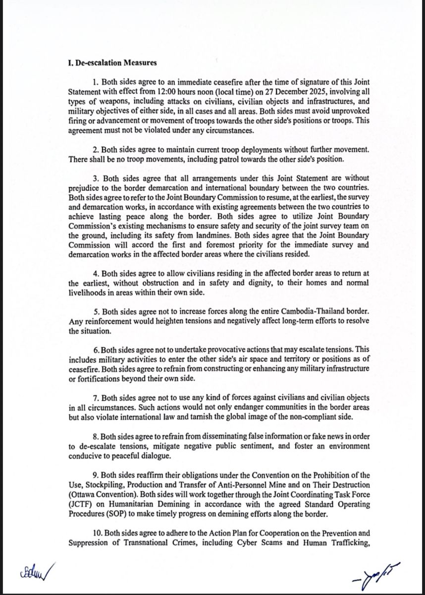 1. ทั้งสองฝ่ายตกลงที่จะหยุดยิงทันทีหลังจากลงนามในแถลงการณ์ร่วมฉบับนี้ โดยมีผลบังคับใช้ตั้งแต่เวลา 12.00 น. (ตามเวลาท้องถิ่น) ของวันที่ 27 ธันวาคม 2568 ครอบคลุมอาวุธทุกประเภท รวมถึงการโจมตีพลเรือน วัตถุพลเรือน และโครงสร้างพื้นฐาน ตลอดจนเป้าหมายทางทหารของฝ่ายใดฝ่ายหนึ่ง ในทุกกรณีและทุกพื้นที่ ทั้งสองฝ่ายต้องหลีกเลี่ยงการยิงหรือการรุกคืบหรือการเคลื่อนกำลังทหารไปยังตำแหน่งหรือกองกำลังของอีกฝ่ายโดยไม่มีการยั่วยุ ข้อตกลงนี้จะต้องไม่ถูกละเมิดไม่ว่าในกรณีใดๆ