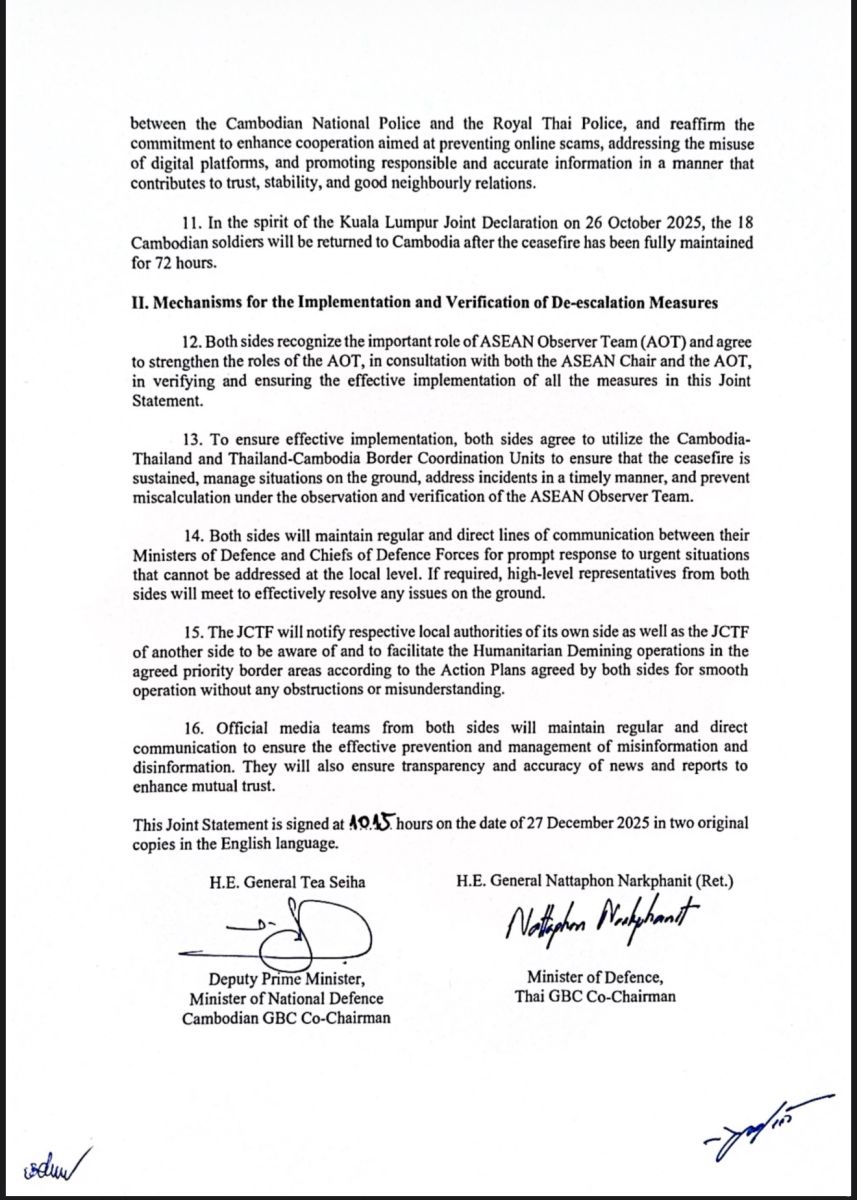 11. ด้วยเจตนารมณ์ของปฏิญญาร่วมกัวลาลัมเปอร์เมื่อวันที่ 26 ตุลาคม 2568 ทหารกัมพูชา 18 นายจะถูกส่งตัวกลับกัมพูชาหลังจากที่การหยุดยิงได้รับการรักษาไว้อย่างสมบูรณ์เป็นเวลา 72 ชั่วโมง