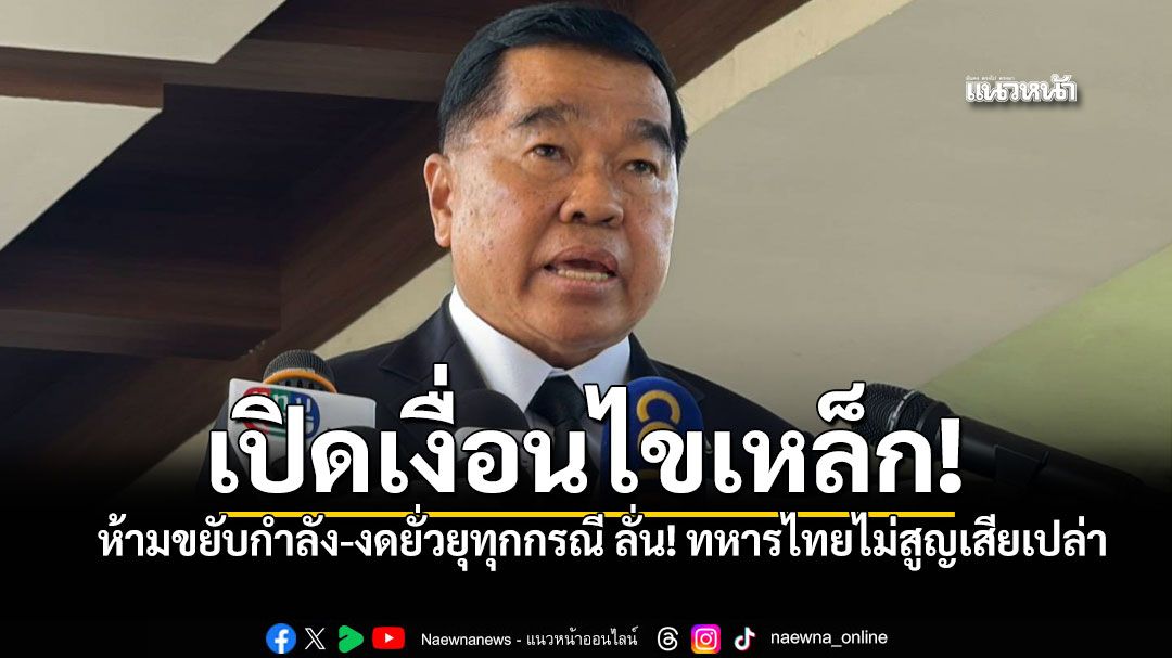 "พล.อ.ณัฐพล" แถลง ไทยบรรลุเงื่อนไข 3 ประการ กัมพูชา ประกาศหยุดยิงก่อน ย้ำ! มีผล 12.00 น. ห้ามเคลื่อนกำลัง เพิ่มเติม ยั่วยุ เฝ้าระวัง 72 ชม. ผุดสายด่วน รมว.กห.-ผบ.ทสส.2 ชาติ ลั่น! ทหารไทย ไม่สูญเสียเปล่า