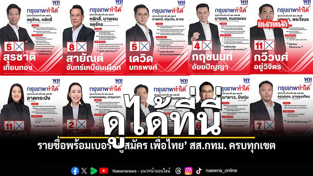 วันที่ 27 ธ.ค. 2568 ภายหลังเสร็จสิ้นการรับสมัครเลือกตั้งสมาชิกสภาผู้แทนราษฎร (สส.) แบบแบ่งเขตเลือกตั้ง และการจับสลากหมายเลขประจำตัวผู้สมัคร พรรคเพื่อไทยได้ประกาศรายชื่อพร้อมหมายเลขผู้สมัครทั้ง 33 เขตในพื้นที่กรุงเทพมหานคร เพื่อเตรียมความพร้อมเดินหน้าหาเสียง ดังนี้