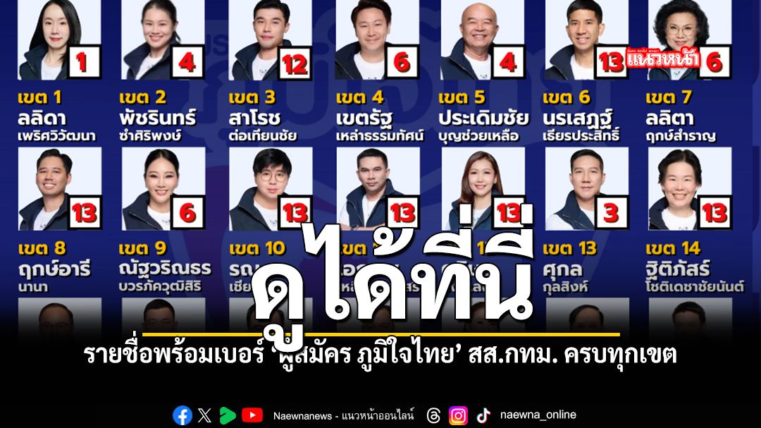 ทั้งนี้ ภายหลังจากกการสมัครรับเลือกตั้งสส. กรุงเทพมหานคร ปรากฏว่า ผู้สมัครของพรรคภูมิใจไทย ได้หมายเลขดังนี้