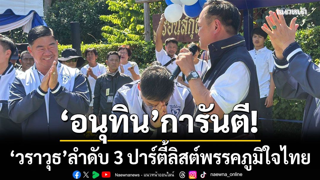 ด้านนายอนุทินกล่าวว่า ไม่ทราบจะขอบพระคุณชาวสุพรรณอย่างไร วันนี้ถือว่ากราบทุกคนที่ให้ให้กำลังใจตน วันที่ 26 ธ.ค.นายวราวุธบอกว่าคนจะไม่เยอะ แต่พอมาถึง “เดินเข้ามาพ่อก็หมาแม่ก็หมา พี่ก็หมา น้องก็หมา หนูก็เลยต้องหมา หมากันทั้งบ้าน” ขอบพระคุณจริงๆ วันนี้ถือเป็นการเอาฤกษ์เบิกชัยของการเลือกตั้ง ในฐานะหัวหน้าพรรคภูมิใจไทยกราบฝากเนื้อฝากตัว ที่สำคัญที่สุดต้องขอบคุณ นายอุดมที่ให้ตนตื๊อนายวราวุธจึงได้แถมมาอีก 5 แต่ทั้งหมดเรารู้จักกันทั้งหมด และนายบรรหาร เคยเรียกตนไปหาแล้วบอกว่าวันหนึ่งถ้าไปไหนให้เอานายวราวุธไปด้วย วันนี้ตนจึงมาบอกว่าได้ทำตามคำสั่งของนายบรรหารเรียบร้อยแล้ว ไม่ต้องห่วงถ้ามีภูมิใจไทย ชาติไทยจะพัฒนา และคนในพรรคภูมิใจไทย 80% ก็มาจากพรรคชาติไทย อย่ามองตนเป็นอื่นไกลเป็นสาแหรกเดียวกันของตนตั้งแต่รุ่นพ่อ วันนี้เรามาเพื่อทำให้สุพรรณบุรีแข็งแกร่ง และสืบสานเจตนารมณ์ของนายบรรหารให้สุพรรณบุรีเจริญยิ่งๆขึ้นไปอีก ตอนไปทำบุรีรัมย์ก็ได้โมเดลจากสุพรรณบุรี เพราะคนที่บุรีรัมย์ก็มาจากชาติไทยมาก่อนจะทำเป็นโมเดลให้ทุกจังหวัดเป็นจังหวัดที่เจริญขึ้น แล้วมาที่นี่กลัวพ่อแม่พี่น้องไม่รักห้อยพระผงสุพรรณมาเลย