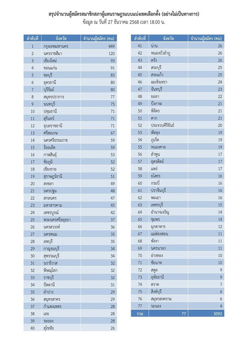 สรุป จำนวนผู้สมัครสมาชิกสภาผู้แทนราษฎรแบบแบ่งเขตเลือกตั้ง (อย่างไม่เป็นทางการ) นะเวลา 18:00 น. วันที่ 27 ธันวาคม รวม 77 จังหวัดมีผู้สมัคร 3,092 คน จำแนกดังนี้กรุงเทพมหานคร 449 คน