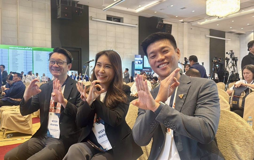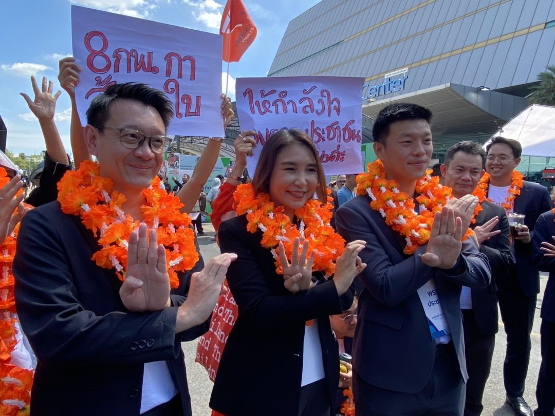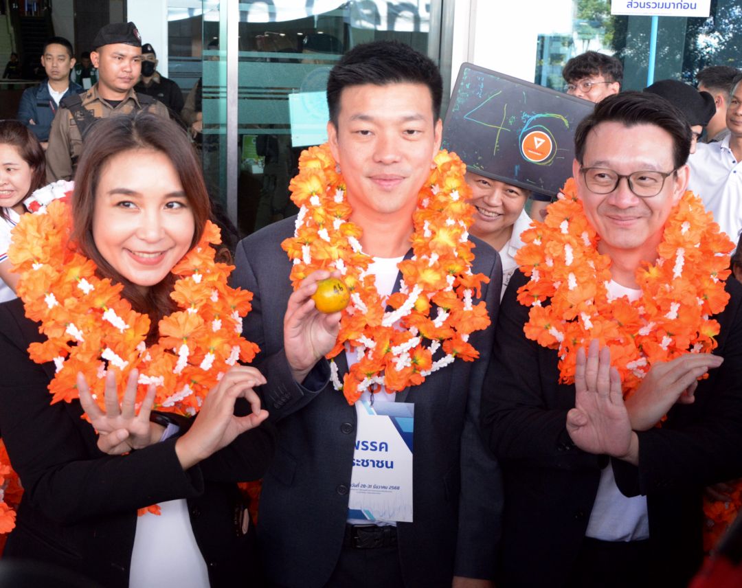 "เท้ง-ไหม-ต้น" 3 แคนดิเดต "พรรคประชาชน" ทำมือสัญลักษณ์หมายเลข 46 เตรียมลุยหาเสียงทันที ชวนประชาชนลงทะเบียนใช้สิทธิ์ล่วงหน้า แจงบัญชีรายชื่อ 99 คน เพราะถอนตัวไป 1 คน