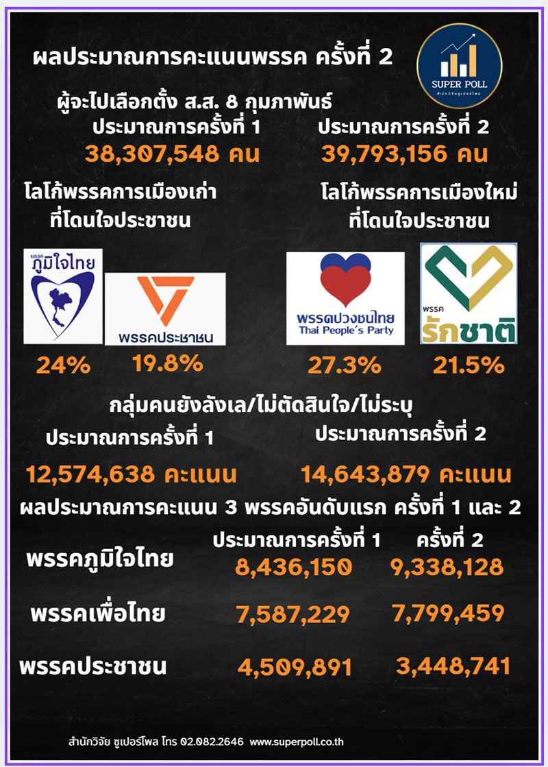 วันที่ 28 ธันวาคม 2568 สำนักวิจัยซูเปอร์โพล เปิดเผยรายงานผลการสำรวจ เรื่อง หลักสถิติ ประมาณการแนวโน้มคะแนนเสียงของพรรคการเมืองครั้งที่ 2 สำรวจจากกลุ่มตัวอย่างประชาชนทุกสาขาอาชีพทั่วประเทศ จำนวนทั้งสิ้น 1,253 ตัวอย่าง โดยใช้หลักสถิติประมาณการคะแนนเสียงในระดับประเทศ อาศัยประสบการณ์และแบบจำลองเชิงสถิติที่เคยใช้มาแล้วในอดีต เช่น กรณีการเลือกตั้งผู้ว่าราชการกรุงเทพมหานคร ที่โพลชี้ว่านายชัชชาติ สิทธิพันธุ์ จะได้รับคะแนนประมาณ 1.2 ล้านเสียง ขณะที่ผลการนับคะแนนจริงอยู่ที่ประมาณ 1.3 ล้านเสียง รวมถึงกรณีการทำโพลลงประชามติรับร่างรัฐธรรมนูญปี 2560 พบว่า คนจะรับร่างรัฐธรรมนูญ 61.5 และ กกต.ประกาศผลจริงว่า คนรับร่างรัฐธรรมนูญ 61.4 โดยดำเนินการศึกษาครั้งนี้ระหว่างวันที่ 25 – 27 ธันวาคม 2568 ที่ผ่านมา ช่วงความคลาดเคลื่อนจากการกำหนดขนาดตัวอย่าง +/- ร้อยละ 5