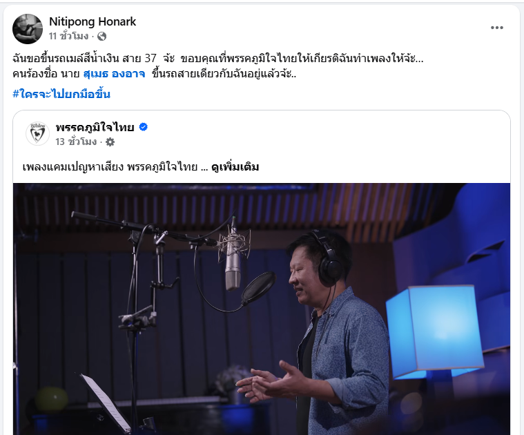 กลายเป็นประเด็นฮือฮาบนโลกโซเชียล เมื่อนักแต่งเพลงระดับตำนานอย่าง "ดี้ นิติพงษ์ ห่อนาค" ออกมาโพสต์เฟซบุ๊กประกาศจุดยืนทางการเมืองอย่างชัดเจน พร้อมเปิดเผยว่าเป็นผู้อยู่เบื้องหลังเพลงแคมเปญใหม่ของพรรคภูมิใจไทย