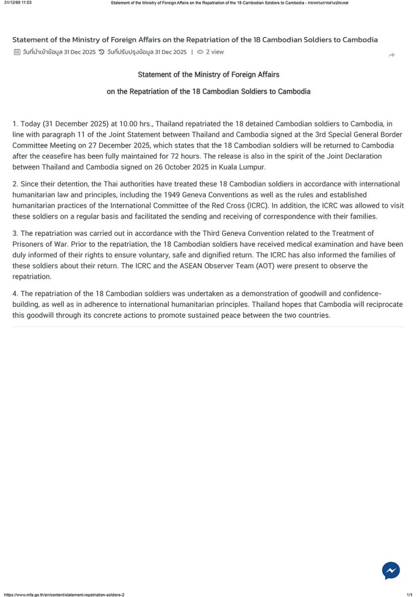 1. วันนี้ (31 ธันวาคม 2568) เวลา 10.00 น. ฝ่ายไทยได้ส่งทหารชาวกัมพูชา 18 คน ที่ถูกทางการไทยควบคุมตัว กลับสู่มาตุภูมิ ซึ่งเป็นการดำเนินการตามข้อ 11 ของถ้อยแถลงร่วม (Joint Statement) ระหว่างไทยกับกัมพูชาที่ได้ลงนามในการประชุมคณะกรรมการชายแดนทั่วไป สมัยพิเศษ ครั้งที่ 3/2568 เมื่อวันที่ 27 ธันวาคม 2568 ซึ่งระบุว่า ไทยจะส่งทหารกัมพูชา 18 คนกลับกัมพูชา ภายหลังจากการหยุดยิงเป็นเวลาต่อเนื่อง 72 ชั่วโมง และเป็นไปตามเจตนารมณ์ของถ้อยแถลงร่วม (Joint Declaration) ระหว่างไทยกับกัมพูชาที่ลงนามเมื่อวันที่ 26 ตุลาคม 2568 ที่กรุงกัวลาลัมเปอร์