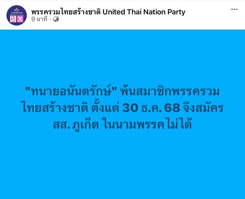 วันที่ 31 ธันวาคม 2568 มีความเคลื่อนไหวสำคัญจากพรรครวมไทยสร้างชาติ (รทสช.) เกี่ยวกับสนามเลือกตั้งจังหวัดภูเก็ต โดยพรรคได้ส่งข้อความลง Facebook ว่า “ทนายอนันตรักษ์ พ้นสมาชิกพรรครวมไทยสร้างชาติ ตั้งแต่ 30 ธ.ค. 68 จึงสมัคร สส. ภูเก็ต ในนามพรรคไม่ได้” หลังจากที่ปรากฎข่าวว่าทนายอนันตรักษ์ เพ็ชรหิน ไปลงชื่อสมัครรับเลือกตั้งสมาชิกสภาผู้แทนราษฎร (สส.) จังหวัดภูเก็ต เขต 1 ในนามพรรครวมไทยสร้างชาติ เมื่อช่วงเช้าวันนี้