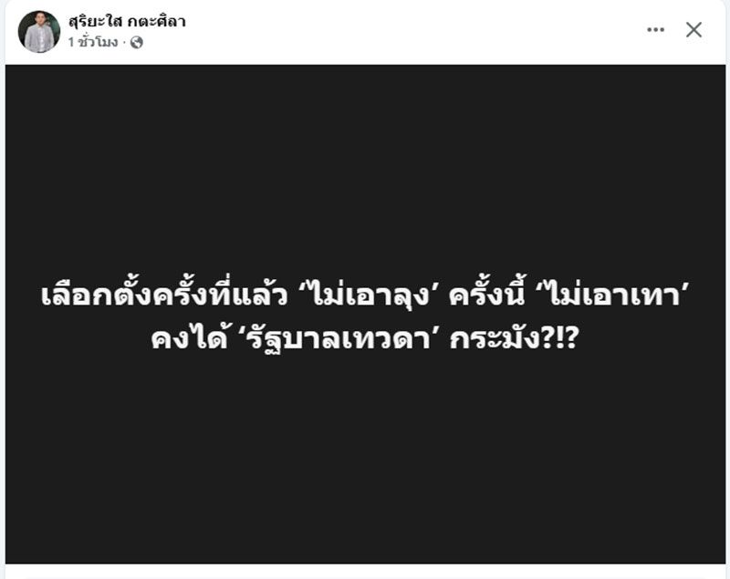 วันที่ 31 ธันวาคม 2568 ดร.สุริยะใส กตะศิลา คณบดีวิทยาลัยผู้นำและนวัตกรรมสังคม มหาวิทยาลัยรังสิต โพสต์ข้อความผ่านเฟซบุ๊ก ระบุว่า เลือกตั้งครั้งที่แล้ว ‘ไม่เอาลุง’ ครั้งนี้ ‘ไม่เอาเทา’ คงได้ ‘รัฐบาลเทวดา’ กระมัง?!?