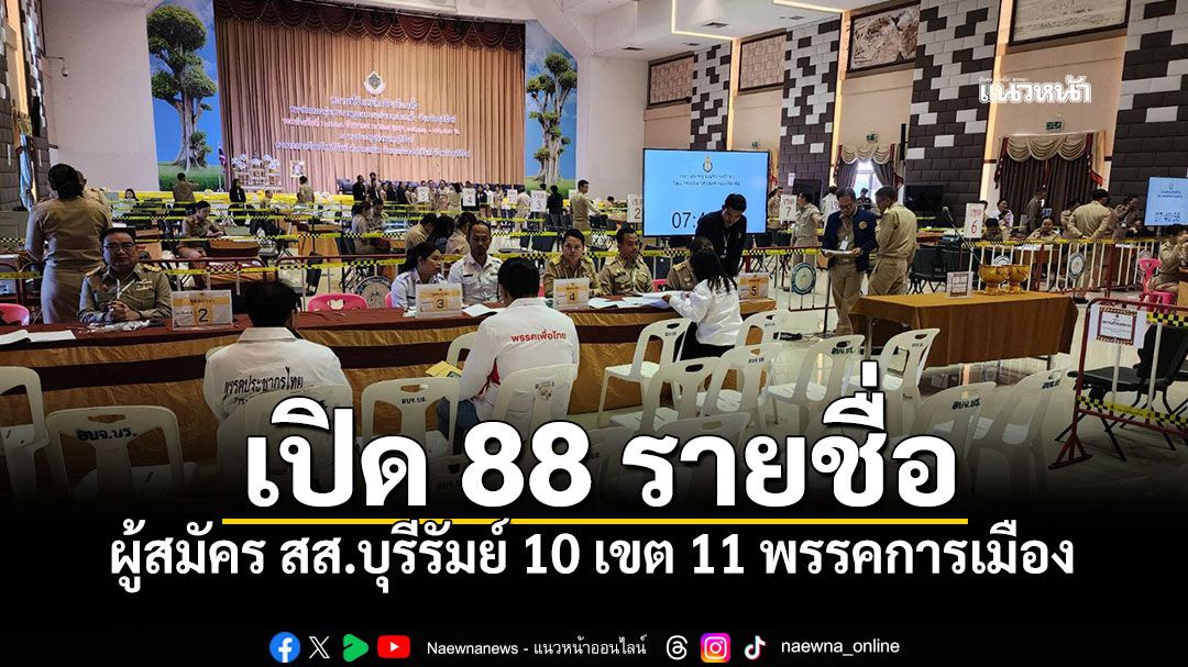 เปิดรายชื่อผู้สมัคร สส.แบบแบ่งเขตเลือกตั้งของจังหวัดบุรีรัมย์ 88 คน ทั้ง 10 เขตเลือกตั้ง จาก 11 พรรคการเมือง จากหลากหลายสาขาอาชีพ ทั้งอดีตรัฐมนตรี อดีต สส. อดีต สจ. ข้าราชการบำนาญ นักธุรกิจ ผู้นำท้องถิ่น เกษตรกร และชาวบ้านทั่วไป ด้าน กกต.เร่งตรวจสอบคุณสมบัติผู้สมัครให้แล้วเสร็จภายใน 7 วัน เพื่อประกาศรายชื่อผู้มีสิทธิ์สมัคร
