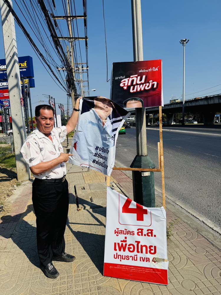 เมื่อวันที่ 1 มกราคม 2569 นายสุทิน นพขำ ผู้สมัคร สส.เขต 4 จ.ปทุมธานี เบอร์ 4 จากพรรคเพื่อไทย (พท.) ได้เดินทางเข้าพบ ร.ต.อ.นัธธวัฒน์ องอาจ รอง สว.(สอบสวน) สภ.ประตูน้ำจุฬาลงกรณ์ เพื่อแจ้งความดำเนินคดี หลังพบว่าป้ายหาเสียงของตน ถูกลอบทำลายอย่างจงใจ จุดเกิดเหตุอยู่บริเวณริมถนนรังสิต-ปทุมธานี หน้าห้างฮาร์ดแวร์เฮาส์ ต.ประชาธิปัตย์ อ.ธัญบุรี พบป้ายหาเสียงสภาพถูกของมีคมกรีดจนพังเสียหาย จำนวน 1 ป้าย ซึ่งถือเป็นการทำลายทรัพย์สิน และขัดขวางการรณรงค์หาเสียงเลือกตั้ง