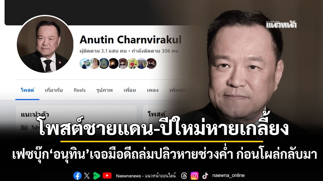 เฟซบุ๊กส่วนตัว ‘นายกฯอนุทิน’ เจอมือดีถล่มปลิวหายช่วงค่ำ ก่อนโผล่กลับมา แต่โพสต์ ‘ภารกิจลงพื้นที่ชายแดน - วันปีใหม่’ หายไปหมด