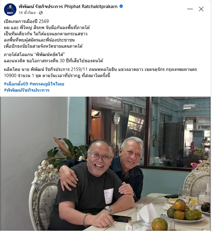 3 มกราคม 2569 นายพิพัฒน์ รัชกิจประการ แกนนำพรรคภูมิใจไทย (ภท.) ดูแลพื้นที่ภาคใต้ โพสต์ข้อความผ่านเฟซบุ๊ก ระบุว่า เปิดเกมการเมืองปี 2569