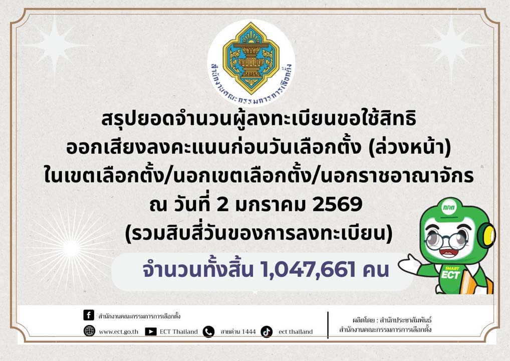 3 มกราคม 2569 สำนักงานคณะกรรมการการเลือกตั้ง ( กกต.) สรุปยอดจำนวนผู้ลงทะเบียนขอใช้สิทธิออกเสียงคะแนนก่อนวันเลือกตั้ง ในเขตเลือกตั้ง นอกเขตเลือกตั้งและนอกราชอาณาจักร รวม 14 วันของการเปิดให้ประชาชนลงทะเบียนขอใช้สิทธิเลือกตั้งล่วงหน้า ระหว่างวันที่ 20 ธ.ค.68-2ม.ค.69 รวมจำนวน 1,047,661 คน พบว่ามีผู้ขอลงทะเบียนขอใช้สิทธิเลือกตั้งล่วงหน้าในเขตเลือกตั้ง จำนวน 4,757 คน มีผู้ขอใช้สิทธิ เลือกตั้งล่วงหน้านอกเขตจำนวน 960,871 คน และมีผู้ขอลงคะแนนออกเสียงนอกราชอาณาจักรจำนวน 82,033 คน