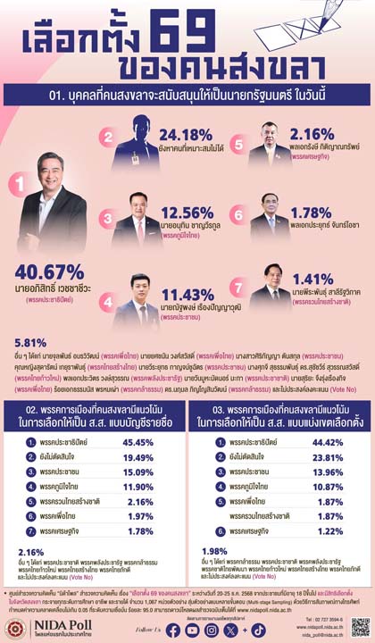4 มกราคม 2569 ศูนย์สำรวจความคิดเห็น “นิด้าโพล” สถาบันบัณฑิตพัฒนบริหารศาสตร์ (นิด้า) เปิดเผยผลการสำรวจ เรื่อง “เลือกตั้ง 69 ของคนสงขลา” ทำการสำรวจระหว่างวันที่ 20 - 25 ธันวาคม 2568 จากประชาชนที่มีอายุ 18 ปีขึ้นไป และมีสิทธิเลือกตั้งในจังหวัดสงขลา กระจายทุกระดับการศึกษา อาชีพ และรายได้ รวมจำนวนทั้งสิ้น 1,067 หน่วยตัวอย่าง เกี่ยวกับการเลือกตั้ง ปี 69 ของคนจังหวัดสงขลา เก็บข้อมูลด้วยวิธีการสัมภาษณ์ทางโทรศัพท์