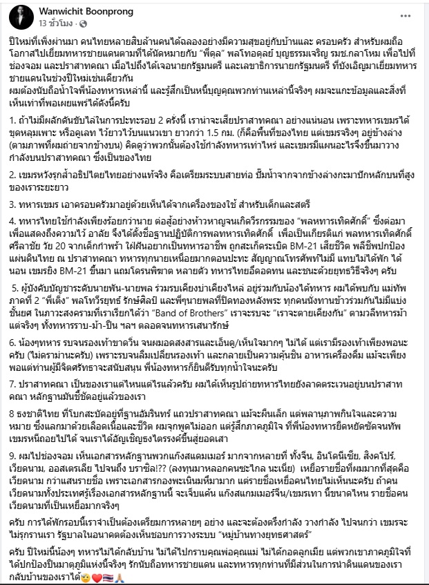 ครับ ปีใหม่นี้น้องๆ ทหารไม่ได้กลับบ้าน ไม่ได้ไปกราบคุณพ่อคุณแม่ ไม่ได้กอดลูกเมีย แต่พวกเขาภาคภูมิใจที่ได้ปกป้องปืนมาตุภูมิแห่งนี้จริงๆ รักนับถือทหารชายแดน และทหารทุกท่านที่มีส่วนในการนำดินแดนของเรากลับบ้านของเราได้