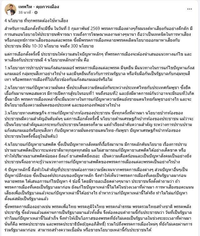 4 มกราคม 2569 นายเทพไท เสนพงศ์ อดีต สส.นครศรีธรรมราช โพสต์ข้อความผ่านเฟซบุ๊ก “เทพไท – คุยการเมือง” หัวข้อ “4 นโยบาย ที่ทุกพรรคต้องใช้หาเสียง” ระบุว่า...