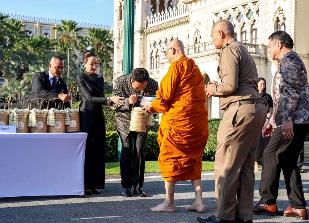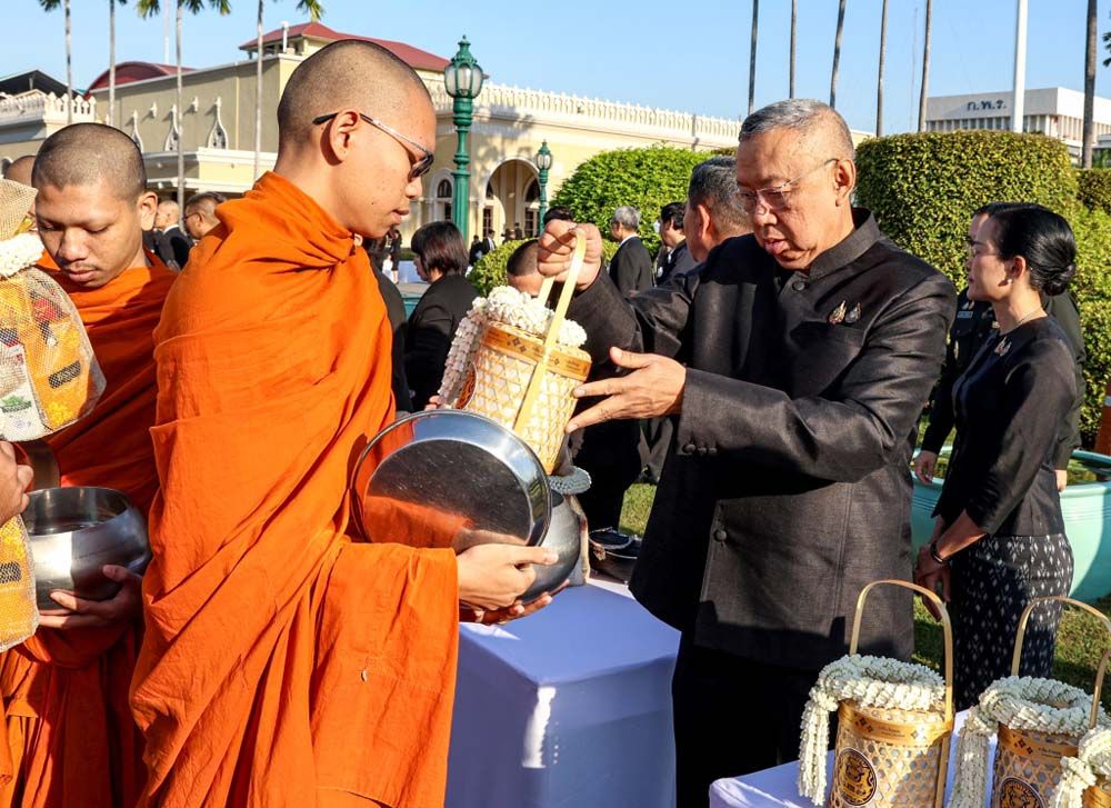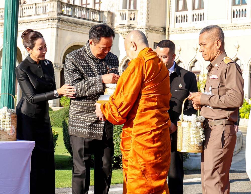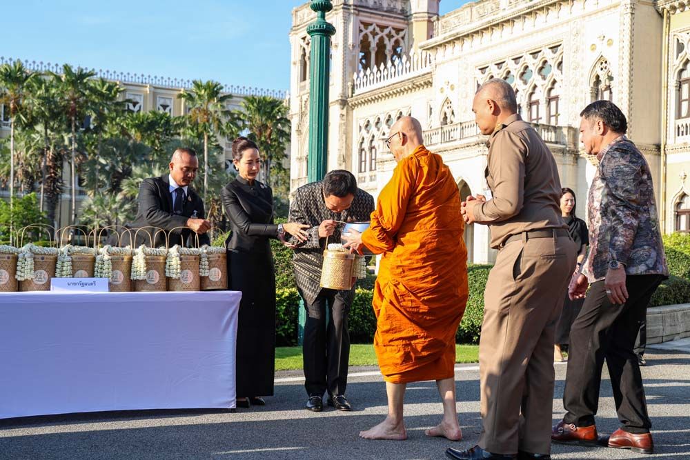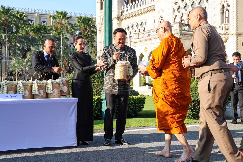 จากนั้น นายกรัฐมนตรี ครม. พร้อมผู้ร่วมพิธีไปยังโต๊ะสำหรับตักบาตร ณ บริเวณแนวถนนด้านหน้าตึกไทยคู่ฟ้าและตึกสันติไมตรี เพื่อร่วมพิธีทำบุญตักบาตร พระสงฆ์เดินออกรับบิณฑบาตจำนวน 69 รูป โดยแบ่งพระสงฆ์เป็น 4 สาย สายละ 18 รูป เสร็จพิธีฯ จบแล้ว นายกรัฐมนตรีสักการะสิ่งศักดิ์สิทธิ์ประจำทำเนียบรัฐบาล (เทพนรสิงห์ พระพรหม พระภูมิ และศาลตายาย) เพื่อความเป็นสิริมงคลในวันขึ้นปีใหม่