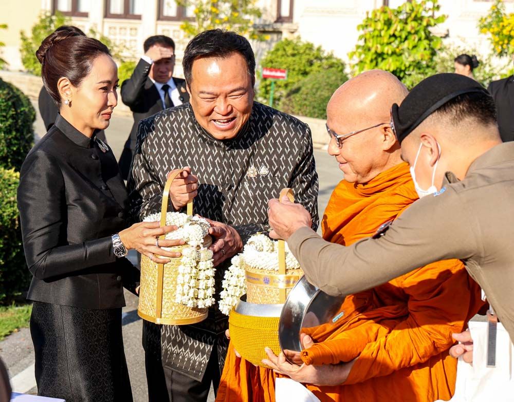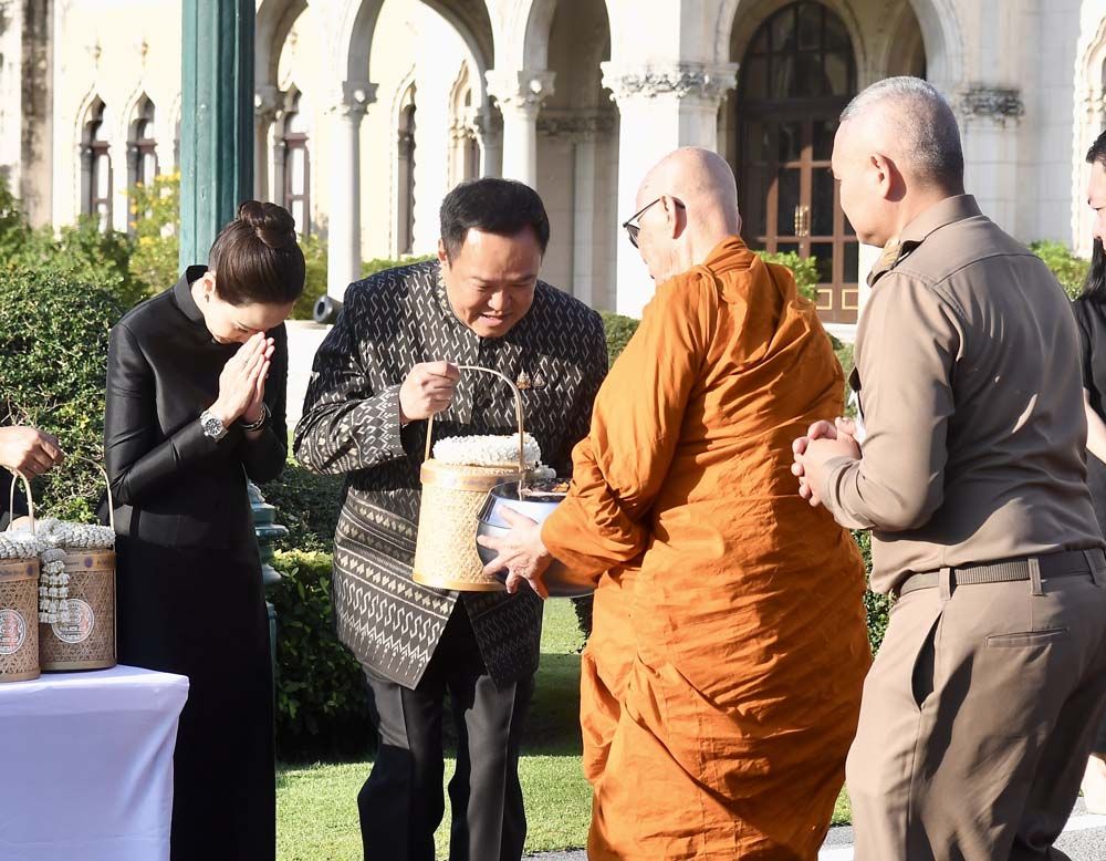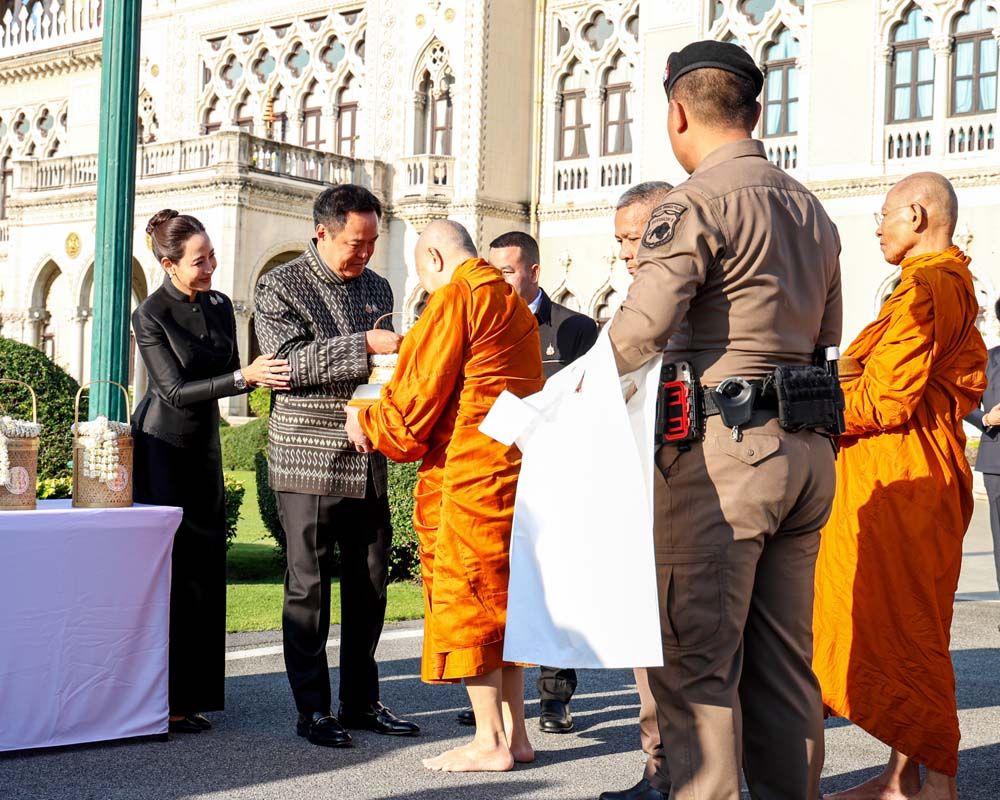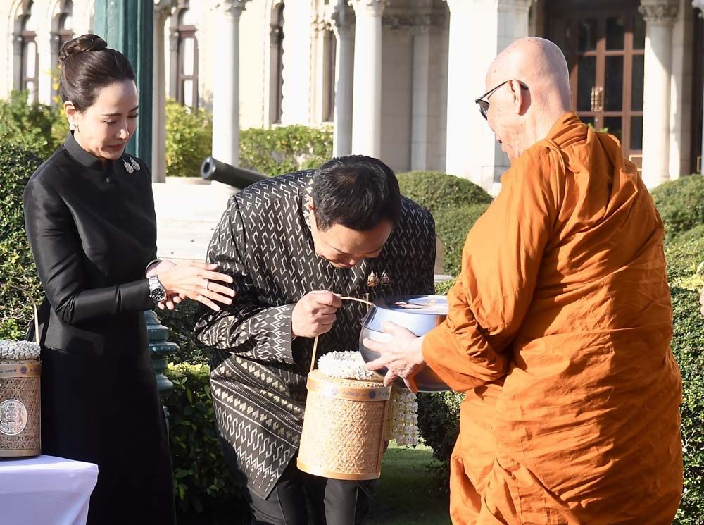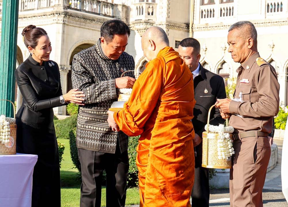 จากนั้น นายกรัฐมนตรี ครม. พร้อมผู้ร่วมพิธีไปยังโต๊ะสำหรับตักบาตร ณ บริเวณแนวถนนด้านหน้าตึกไทยคู่ฟ้าและตึกสันติไมตรี เพื่อร่วมพิธีทำบุญตักบาตร พระสงฆ์เดินออกรับบิณฑบาตจำนวน 69 รูป โดยแบ่งพระสงฆ์เป็น 4 สาย สายละ 18 รูป เสร็จพิธีฯ จบแล้ว นายกรัฐมนตรีสักการะสิ่งศักดิ์สิทธิ์ประจำทำเนียบรัฐบาล (เทพนรสิงห์ พระพรหม พระภูมิ และศาลตายาย) เพื่อความเป็นสิริมงคลในวันขึ้นปีใหม่