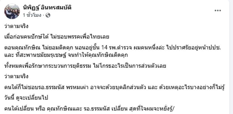 วันที่ 5 มกราคม 259 นายนิพิฏฐ์ อินทรสมบัติ อดีต สส.พัทลุง และสมาชิกพรรคประชาธิปัตย์ (ปชป.) โพสต์เฟซบุ๊ก ระบุว่า ว่าตามจริง เมื่อก่อนคนปักษ์ใต้ ไม่ชอบพรรคเพื่อไทยเลย