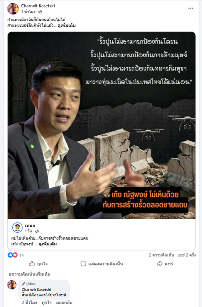 พร้อมทั้งแชร์ภาพ นายณัฐพงษ์ เรืองปัญญาวุฒิ หัวหน้าพรรคประชาชน (ปชน.) ที่มีข้อความระบุว่า "รั้วปูนไม่สามารถป้องกันโดรน รั้วปูนไม่สามารถป้องกันการค้ามนุษย์ รั้วปูนไม่สามารถป้องกันทหารกัมพูชามาวางทุ่นระเบิดในประเทศไทยได้แน่นอน เท้ง ณัฐพงษ์ ไม่เห็นด้วยกับการสร้างรั้วตลอดชายแดน "
