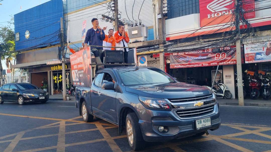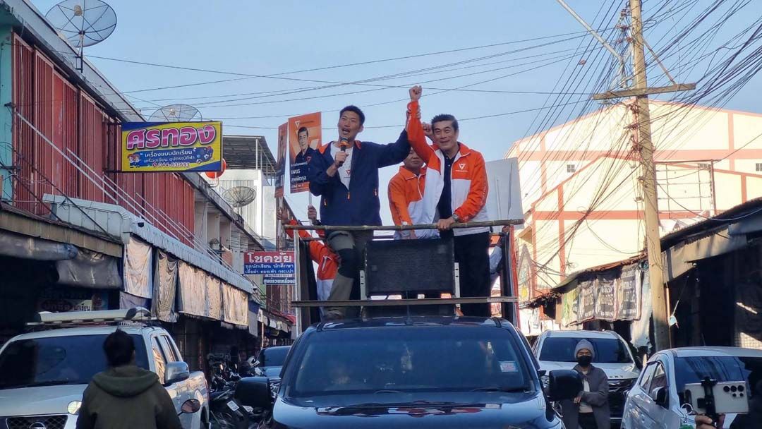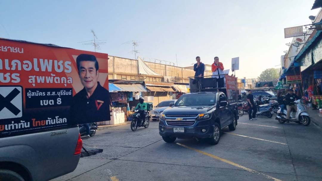 จากนั้น นายธนาธร พร้อม นายเพชร สุพัตตกุล ผู้สมัคร สส.บุรีรัมย์ หมายเลข 1 เขตเลือกตั้งที่ 8 พรรคประชาชน ขึ้นรถปราศรัยตามตลาดสดในเขตเทศบาลเมืองนางรอง เพื่อขอคะแนนจากพ่อค้าแม่ค้าและประชาชนที่มาจับจ่ายซื้อสินค้าในตลาดสด อ.นางรอง จ.บุรีรัมย์ ซึ่งเขตเลือกตั้งที่ 8 เจ้าของพื้นที่เดิม นายไตรเทพ งามกมล จากพรรคภูมิใจไทย การเลือกตั้งคราวนี้ ทางพรรคประชาชนคาดหวังจะได้ สส.บุรีรัมย์ ในเขตเลือกตั้งนี้