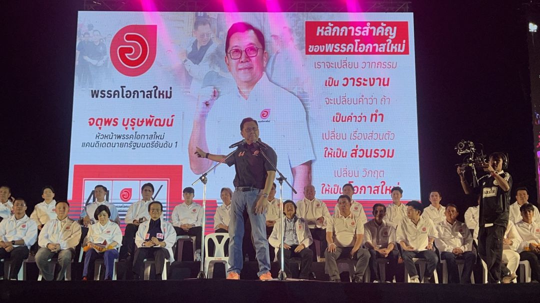 เมื่อวันที่ 9 ม.ค.69 ที่ลานคนเมือง กรุงเทพมหานคร พรรคโอกาสใหม่ จัดปราศรัยใหญ่ครั้งแรก นำโดย แคนดิเดตนายกรัฐมนตรีทั้ง 3 คน ได้แก่ นายจตุพร บุรุษพัฒน์ หัวหน้าพรรค นพ.ทศพร เสรีรักษ์ นายประภัสร์ จงสงวน พร้อมด้วย ผู้สมัคร สส. กทม.ทั้ง 33 เขต และผู้สมัครระบบบัญชีรายชื่อพรรค เข้าร่วมอย่างพร้อมเพรียง ทั้งนี้ก่อนเปิดปราศรัย นายจตุพรและคณะ ได้เข้าพบนายชัชชาติ สิทธิพันธุ์ ผู้ว่าราชการกรุงเทพมหานคร ที่หน้าศาลาว่าการ กทม. โดยนายชัชชาติให้การต้อนรับอย่างอบอุ่น ทั้งสองฝ่ายได้แลกเปลี่ยนข้อมูล ฝุ่น PM 2.5 โดยผู้ว่าฯ กทม. ฝากนโยบายคุณภาพอากาศ เพราะ กทม.ต้องอาศัยส่วนกลาง จากนั้นนายจตุพร ได้ชนหมัดกับนายชัชชาติ ก่อนจะบอกว่า ”ชนหมัดไม่ได้ทะเลาะกัน เป็นเพื่อนกัน“