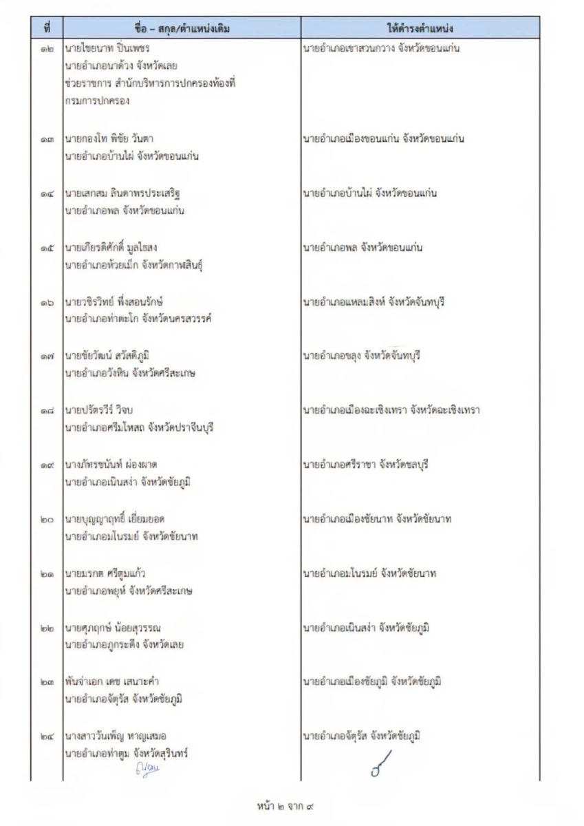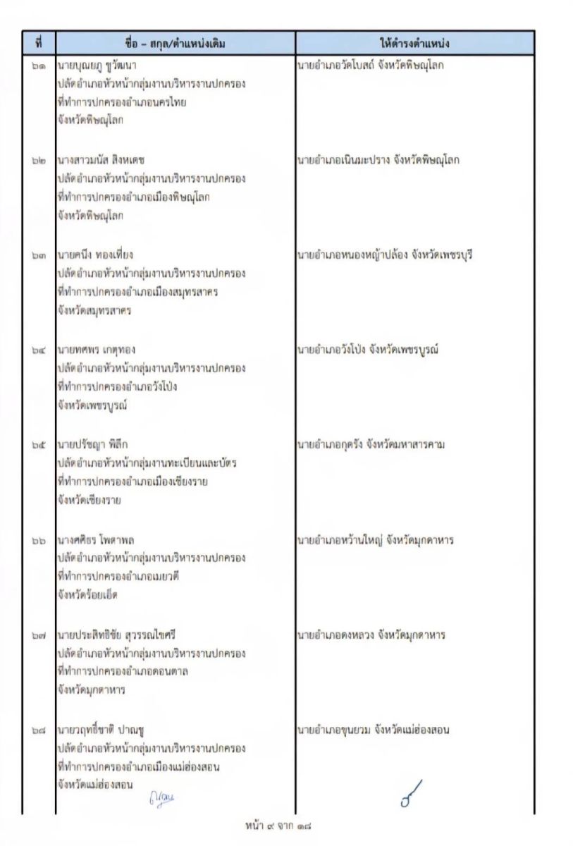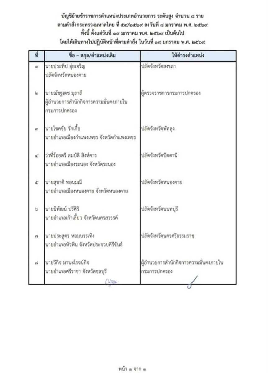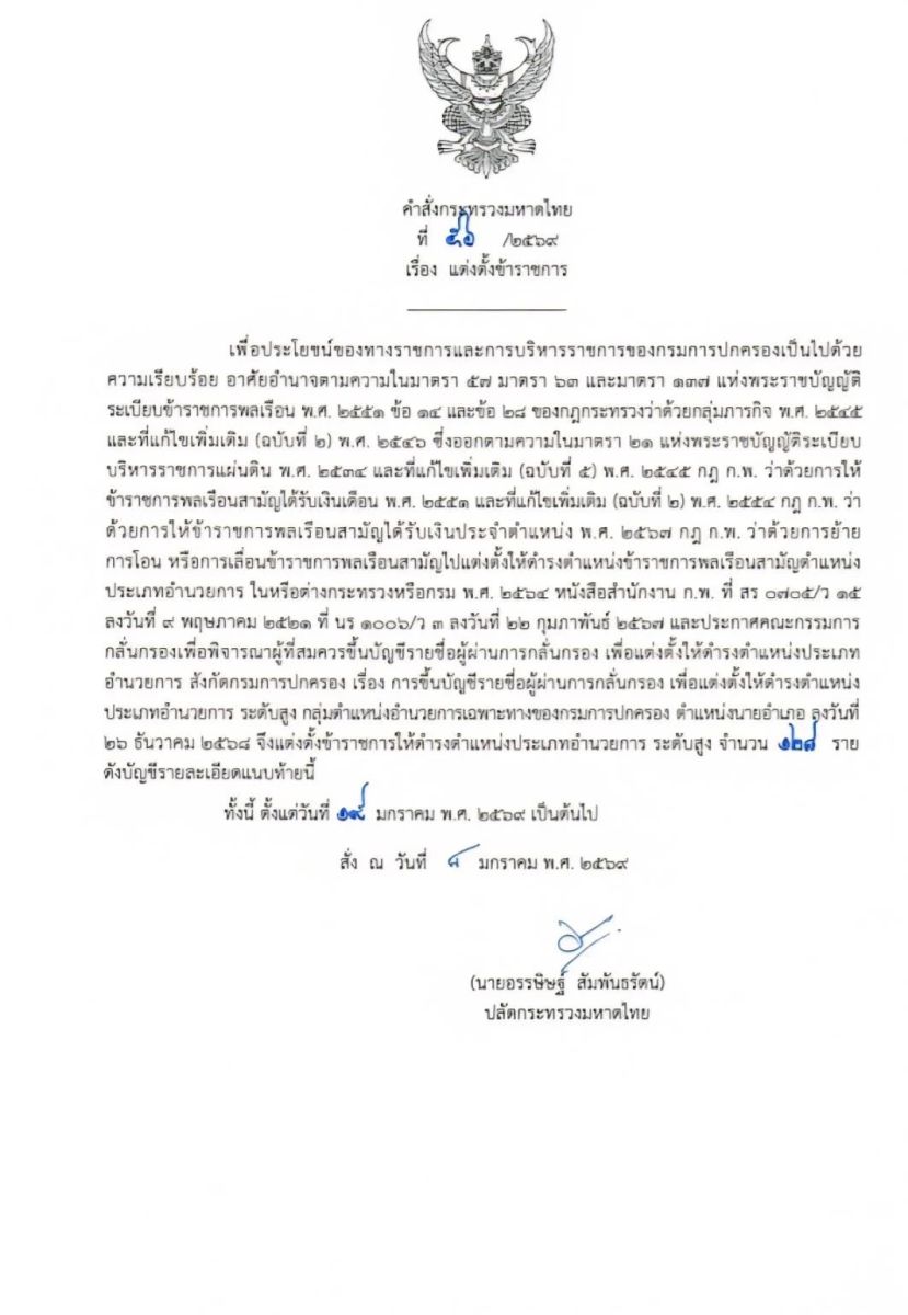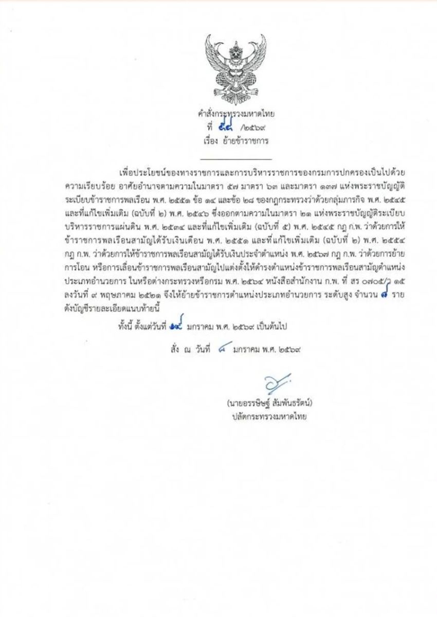 10 ม.ค.69 ผู้สื่อข่าวรายงานว่า นายอรรษิษฐ์ สัมพันธรัตน์ ปลัดกระทรวงมหาดไทย ได้ลงนามในคำสั่งกระทรวงมหาดไทย จำนวน3คำสั่ง ได้แก่ คำสั่งกระทรวงมหาดไทยที่ 54/2569 เรื่อง ย้ายข้าราชการตำแหน่งประเภทอำนวยการสูง ระดับสูง จำนวน 8 ราย ในตำแหน่งปลัดจังหวัด และผู้ตรวจกรมการปกครอง โดยให้ไปรับตำแหน่งในวันที่ 19 มกราคม 2569