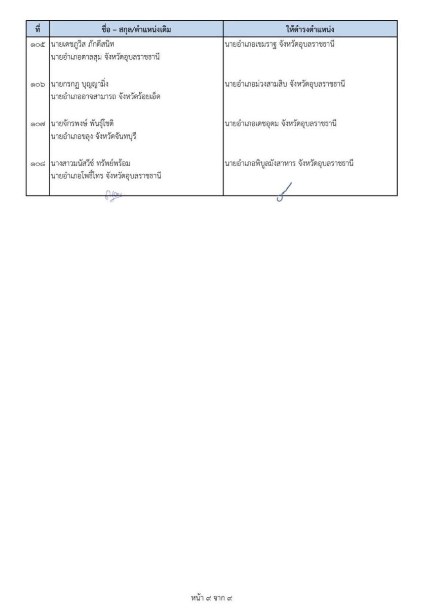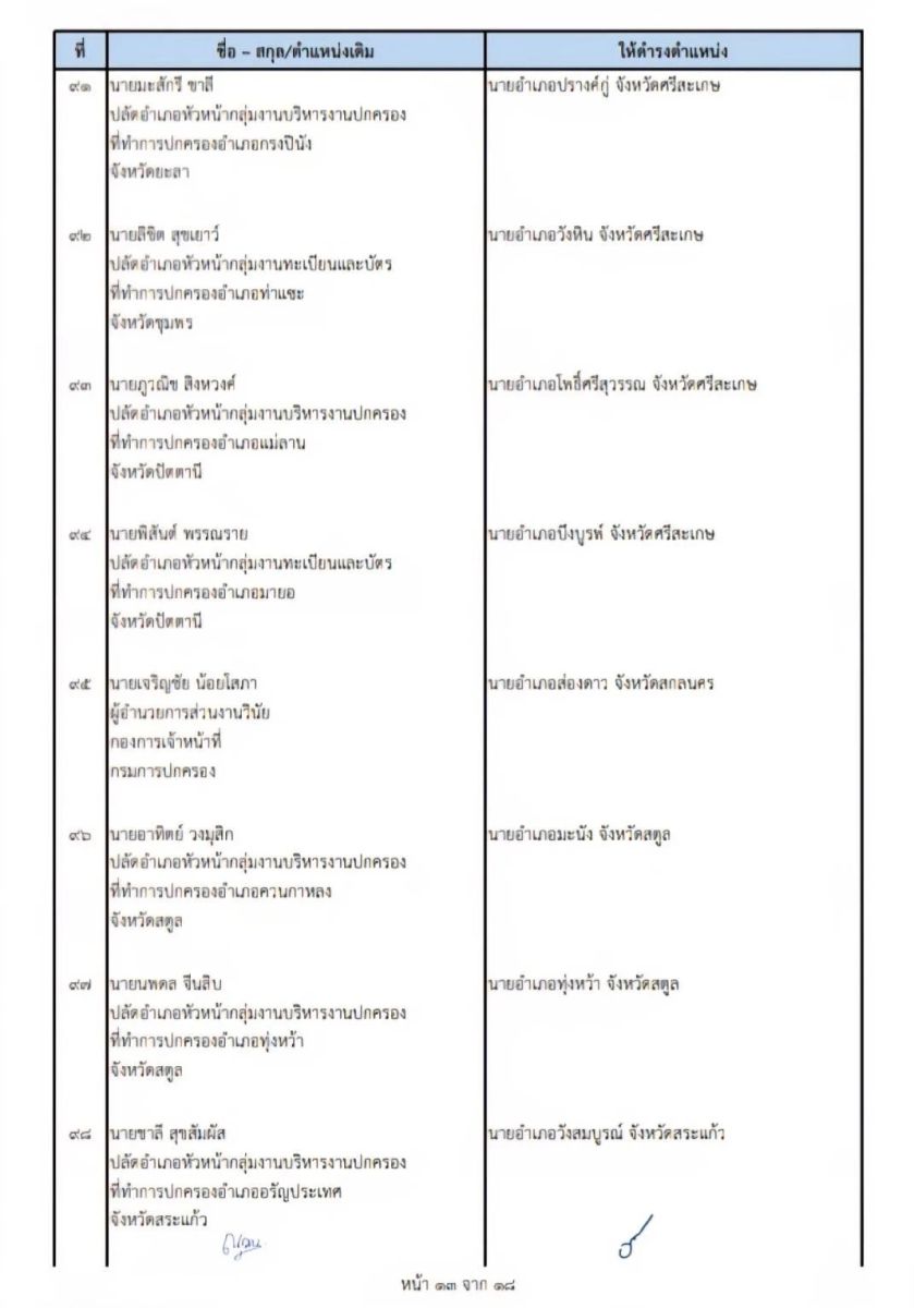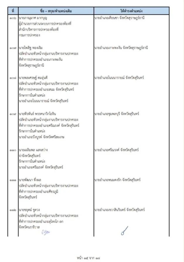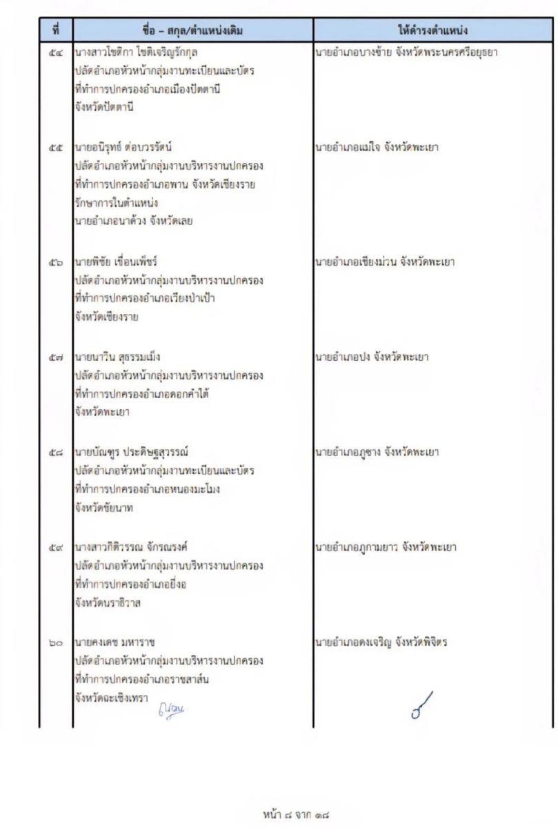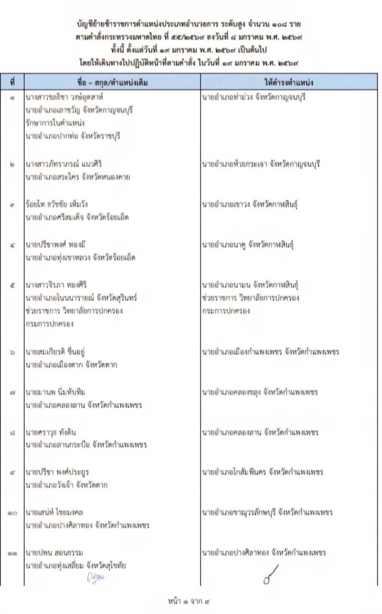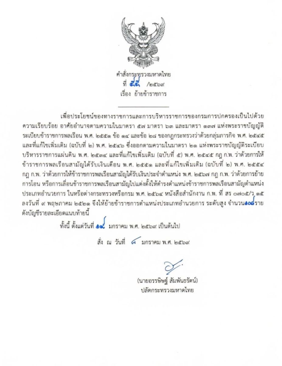 คำสั่งกระทรวงมหาดไทยที่ 55/2569 เรื่อง ย้ายข้าราชการตำแหน่งประเภทอำนวยการสูง ระดับสูง จำนวน 108 ราย ในตำแหน่งนายอำเภอ โดยให้ไปรับตำแหน่งในวันที่ 19 มกราคม 2569 เช่นกัน