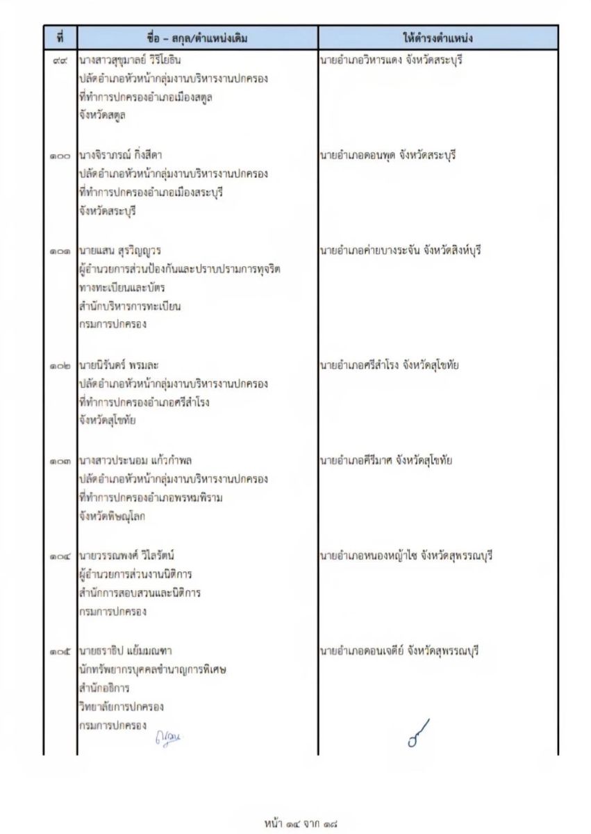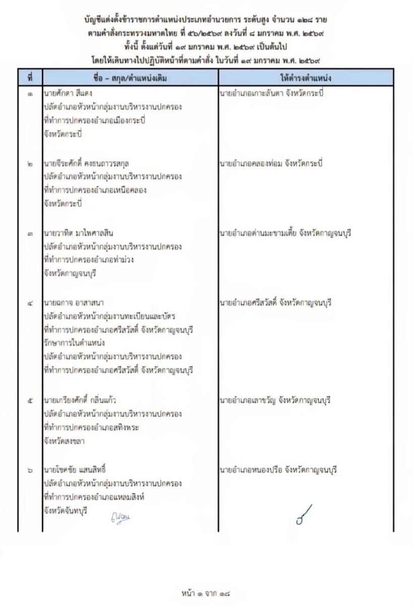 และคำสั่งกระทรวงมหาดไทยที่ 56/2569 แต่งตั้งข้าราชการระดับสูง ประเภทอำนวยการอีก 128 ราย ในตำแหน่งนายอำเภอ โดยให้ไปรับตำแหน่งในวันที่ 19 มกราคม 2569 ทั้งนี้ สำหรับรายชื่อตามบัญชีแต่งตั้งโยกย้ายทั้ง3คำสั่ง มีรายละเอียดสามารถติดตามได้ดังนี้