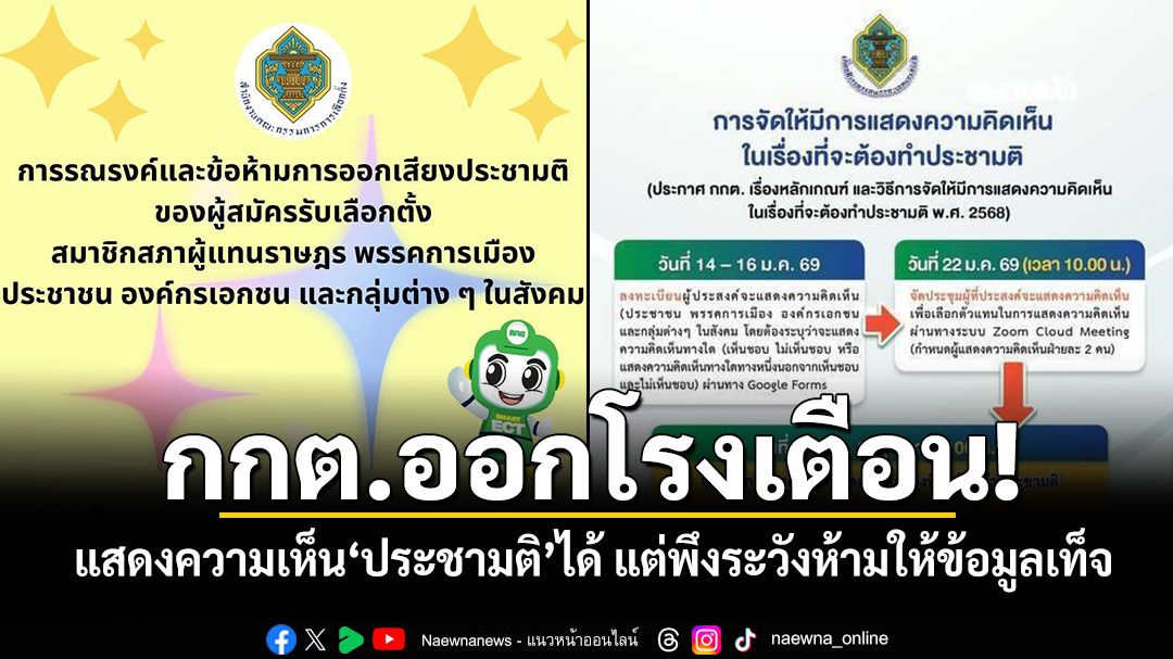 เมื่อวันที่ 12 มกราคม 2569 ผู้สื่อข่าวรายงานว่าสำนักงานคณะกรรมการการเลือกตั้ง (กกต.) ออกเอกสารแจ้งเตือนในการรณรงค์และข้อห้ามการออกเสียงประชามติ สำหรับผู้สมัครรับเลือกตั้ง สส. พรรคการเมือง ประชาชน องค์กรเอกชน และกลุ่มต่างๆ ที่จะแสดงความคิดเห็นเกี่ยวกับประชามติ ในหัวข้อเห็นชอบหรือไม่เห็นชอบในการจัดทำร่างรัฐธรรมนูญฉบับใหม่ หลังจากสำนักงานฯ ออกประกาศคณะกรรมการการเลือกตั้ง เรื่อง หลักเกณฑ์และวิธีการการจัดให้มีการแสดงความคิดเห็นในเรื่องที่จะต้องจัดทำประชามติ พ.ศ.2568 โดยเน้นย้ำว่า ผู้สมัคร สส. พรรคการเมือง ประชาชน องค์กรเอกชน และกลุ่มต่างๆ ในสังคม ย่อมมีสิทธิและเสรีภาพตามรัฐธรรมนูญในการจัดกิจกรรมรณรงค์เพื่อการออกเสียงประชามติได้โดยเสรีเสมอภาคและเท่าเทียมกัน ตามหลักเกณฑ์และวิธีการที่คณะกรรมการการเลือกตั้งกำหนด ซึ่งเป็นไปตามมาตรา 17 พระราชบัญญัติว่าด้วยการออกเสียงประชามติ พ.ศ.2564 แต่ต้องพึงระวังไม่ให้ฝ่าฝืนมาตรา 77 , 78 , 79 และ 80 ของกฎหมายฉบับเดียวกัน