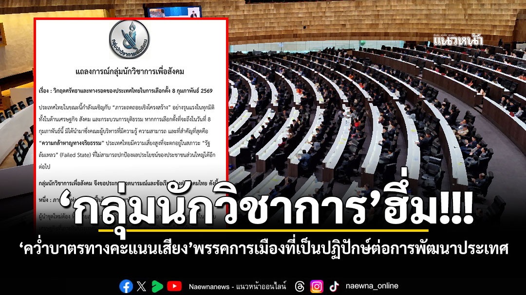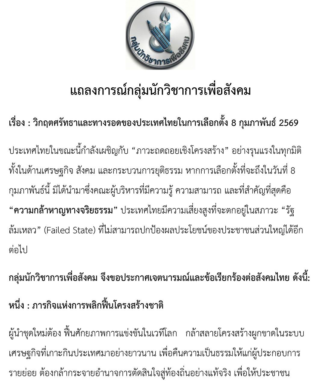 แถลงการณ์กลุ่มนักวิชาการเพื่อสังคม เรื่อง : วิกฤตศรัทธาและทางรอดของประเทศไทยในการเลือกตั้ง 8 กุมภาพันธ์ 2569