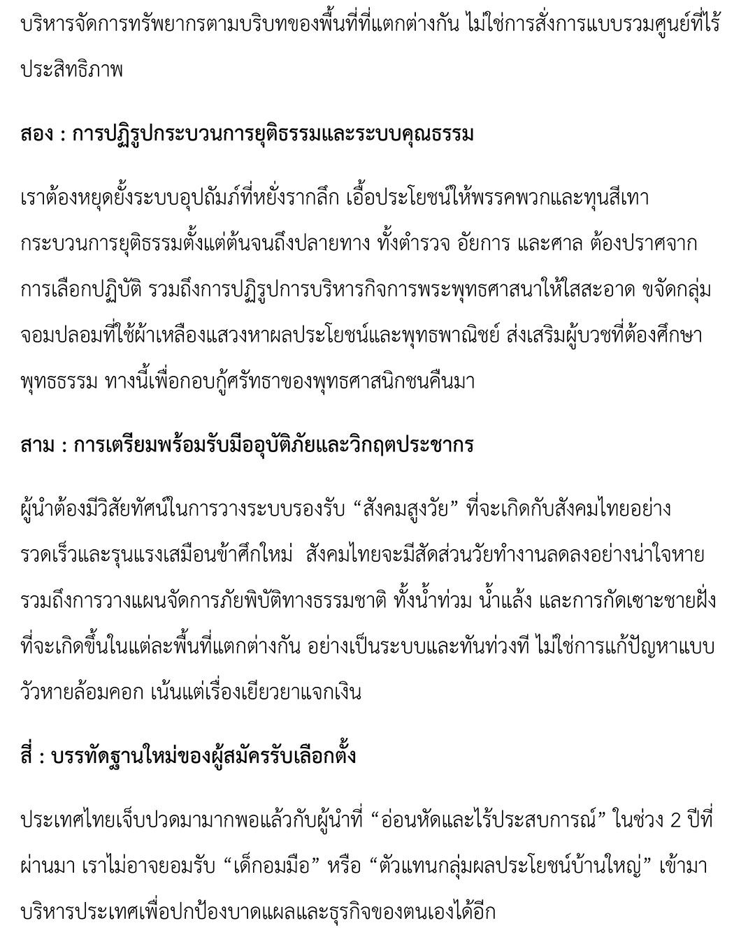 เราต้องหยุดยั้งระบบอุปถัมภ์ที่หยั่งรากลึก เอื้อประโยชน์ให้พรรคพวกและทุนสีเทา กระบวนการยุติธรรมตั้งแต่ต้นจนถึงปลายทาง ทั้งตำรวจ อัยการ และศาล ต้องปราศจากการเลือกปฏิบัติ รวมถึงการปฏิรูปการบริหารกิจการพระพุทธศาสนาให้ใสสะอาด ขจัดกลุ่มจอมปลอมที่ใช้ผ้าเหลืองแสวงหาผลประโยชน์และพุทธพาณิชย์ ส่งเสริมผู้บวชที่ต้องศึกษาพุทธธรรม ทางนี้เพื่อกอบกู้ศรัทธาของพุทธศาสนิกชนคืนมา
