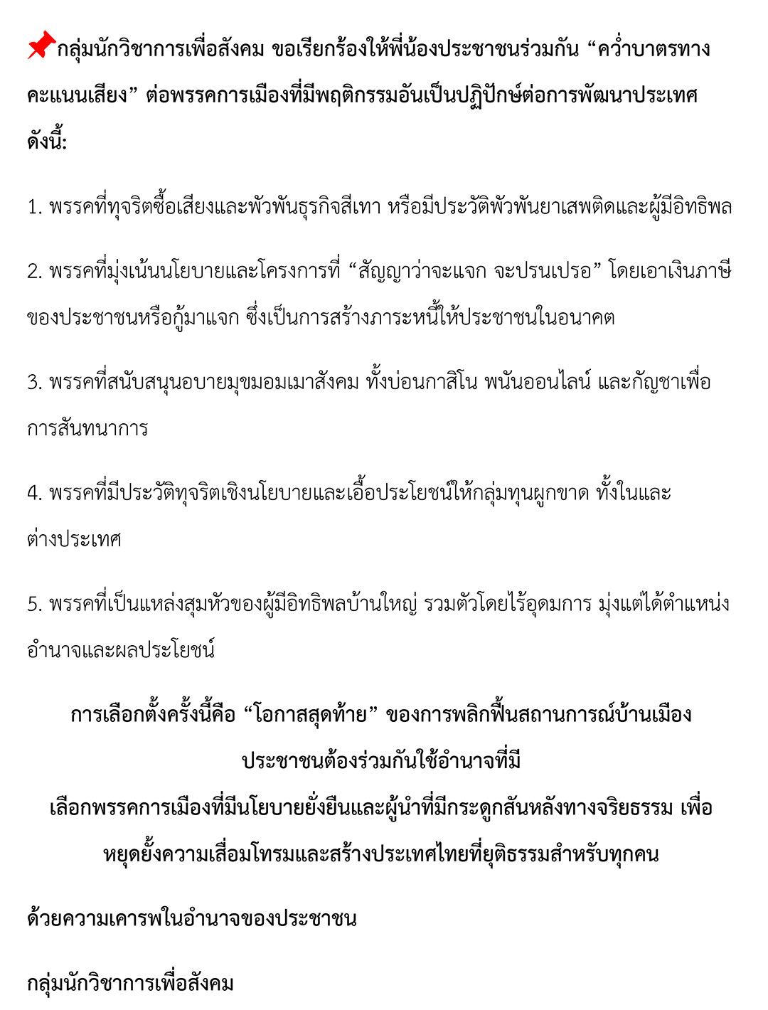 กลุ่มนักวิชาการเพื่อสังคม ขอเรียกร้องให้พี่น้องประชาชนร่วมกัน “คว่ำบาตรทางคะแนนเสียง” ต่อพรรคการเมืองที่มีพฤติกรรมอันเป็นปฏิปักษ์ต่อการพัฒนาประเทศ ดังนี้: