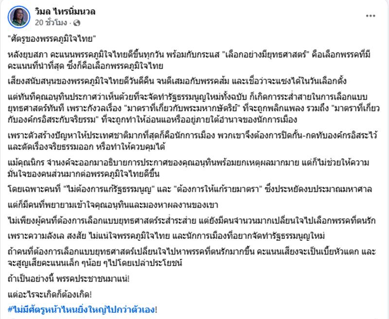 วันที่ 14 มกราคม 2569 นายวิมล ไทรนิ่มนวล นักเขียนรางวัลซีไรต์ ได้โพสต์เฟซบุ๊ก ระบุว่า "ศัตรูของพรรคภูมิใจไทย"