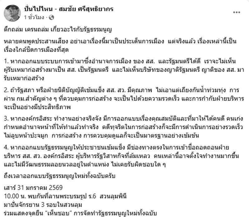 วันที่ 16 มกราคม 2569 นายสมชัย ศรีสุทธิยากร อดีตกรรมการการเลือกตั้ง (กกต.) โพสต์ข้อความระบุว่า “ตึกถล่ม เครนถล่ม เกี่ยวอะไรกับรัฐธรรมนูญ”