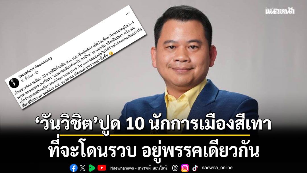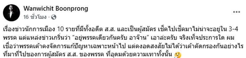 วันที่ 16 มกราคม 2569 ผศ.ดร.วันวิชิต บุญโปร่ง ที่ปรึกษารัฐมนตรีว่าการกระทรวงกลาโหม โพสต์ข้อความผ่านเฟซบุ๊ก ระบุว่า เรื่องข่าวนักการเมือง 10 รายที่มีทั้งอดีต ส.ส. และเป็นผู้สมัคร เช็คไปเช็คมาไม่น่าจะอยู่ใน 3-4 พรรค แต่แหล่งข่าวเกริ่นว่า “อยู่พรรคเดียวกันครับ อาจ๊าน”